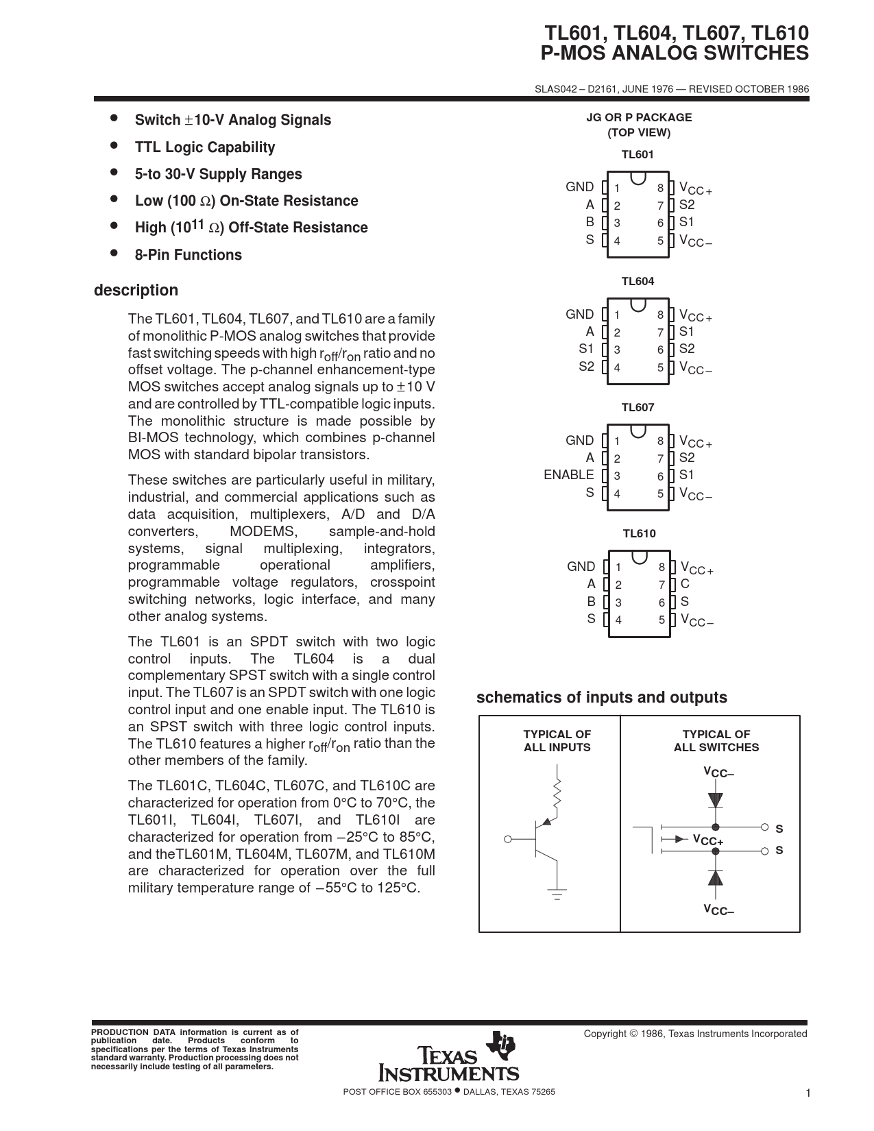 TL601, TL604, TL607, TL610P-MOS ANALOG SWITCHES SLAS042 – D2161, JUNE 1976 — REVISED OCTOBER 1986 • Switch ± 10-V Analog SignalsJG OR P PACKAGE • (TOP VIEW)TTL Logic CapabilityTL601 • 5-to 30-V Supply Ranges • GND 1 8 VCC+ Low (100 Ω ) On-State Resistance A 2 7 S2 • High (1011 Ω ) Off-State Resistance B 3 6 S1 • S 4 5 VCC– 8-Pin FunctionsTL604description The TL601, TL604, TL607, and TL610 are a family GND 1 8 VCC+ of monolithic P-MOS analog switches that provide A 2 7 S1 fast switching speeds with high r S1 3 6 S2 off/ron ratio and no offset voltage. The p-channel enhancement-type S2 4 5 VCC– MOS switches accept analog signals up to ± 10 V and are controlled by TTL-compatible logic inputs. TL607 The monolithic structure is made possible by BI-MOS technology, which combines p-channel GND 1 8 VCC+ MOS with standard bipolar transistors. A 2 7 S2 These switches are particularly useful in military, ENABLE 3 6 S1 industrial, and commercial applications such as S 4 5 VCC– data acquisition, multiplexers, A/D and D/A converters, MODEMS, sample-and-hold TL610 systems, signal multiplexing, integrators, programmable operational amplifiers, GND 1 8 VCC+ programmable voltage regulators, crosspoint A 2 7 C switching networks, logic interface, and many B 3 6 S other analog systems. S 4 5 VCC– The TL601 is an SPDT switch with two logic control inputs. The TL604 is a dual complementary SPST switch with a single control input. The TL607 is an SPDT switch with one logic schematics of inputs and outputs control input and one enable input. The TL610 is an SPST switch with three logic control inputs. TYPICAL OFTYPICAL OF The TL610 features a higher roff/ron ratio than the ALL INPUTSALL SWITCHES other members of the family. VCC– The TL601C, TL604C, TL607C, and TL610C are characterized for operation from 0°C to 70°C, the TL601I, TL604I, TL607I, and TL610I are S characterized for operation from – 25°C to 85°C, VCC+ and theTL601M, TL604M, TL607M, and TL610M S are characterized for operation over the full military temperature range of – 55°C to 125°C. VCC–PRODUCTION DATA information is current as of Copyright 1986, Texas Instruments Incorporated publication date. Products conform to specifications per the terms of Texas Instruments standard warranty. Production processing does not necessarily include testing of all parameters. POST OFFICE BOX 655303 • DALLAS, TEXAS 75265 1