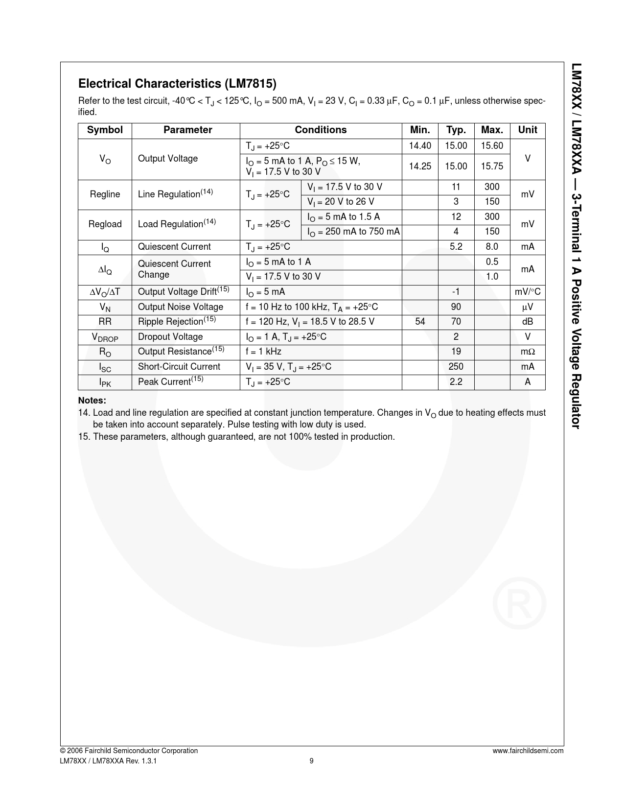 LM78XX / LM78XXA —. Electrical Characteristics (LM7815). Symbol. Parameter. Conditions. Min. Typ. Max. Unit. 3-T. e rminal. 1 A Positive V