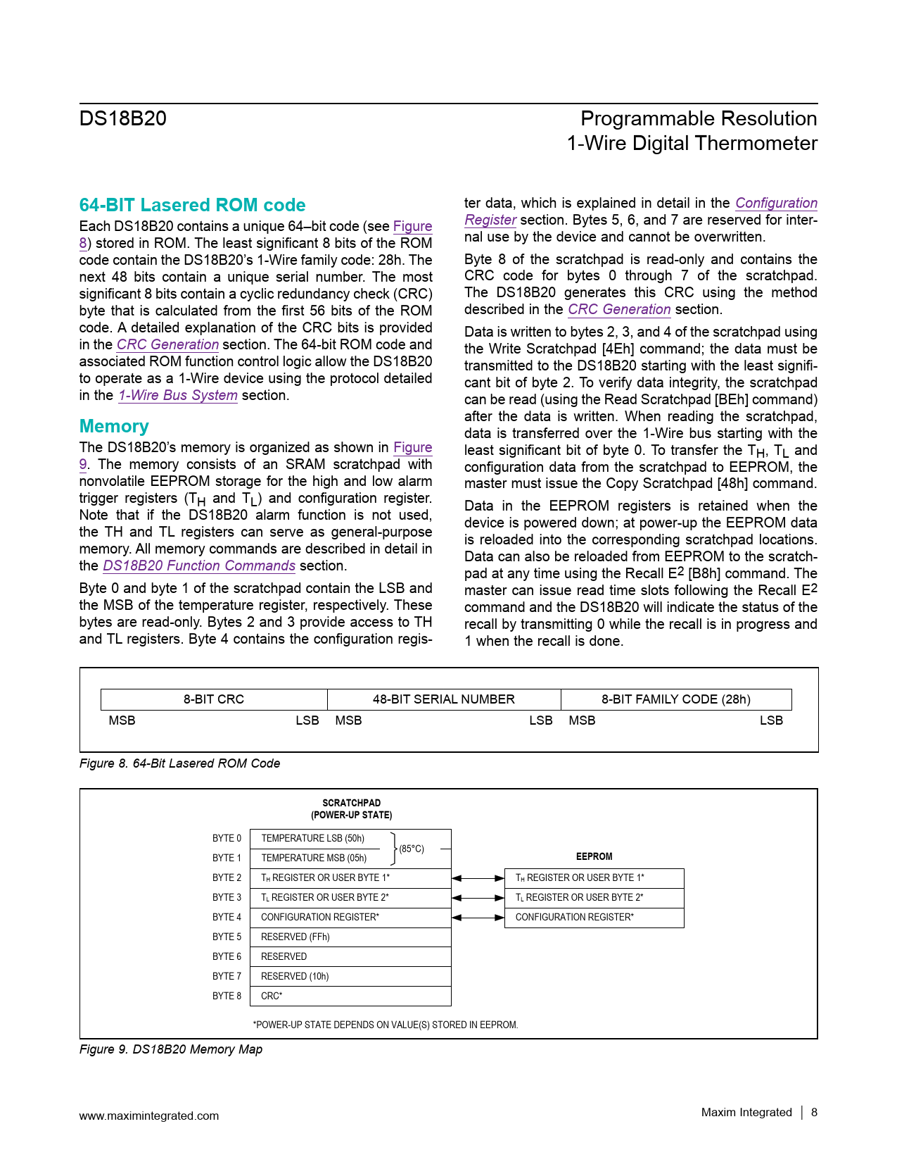 Pages / Page20 / 8 — 64-BIT Lasered ROM code. Memory. SCRATCHPAD. (POWER-UP STATE). EEPROM
