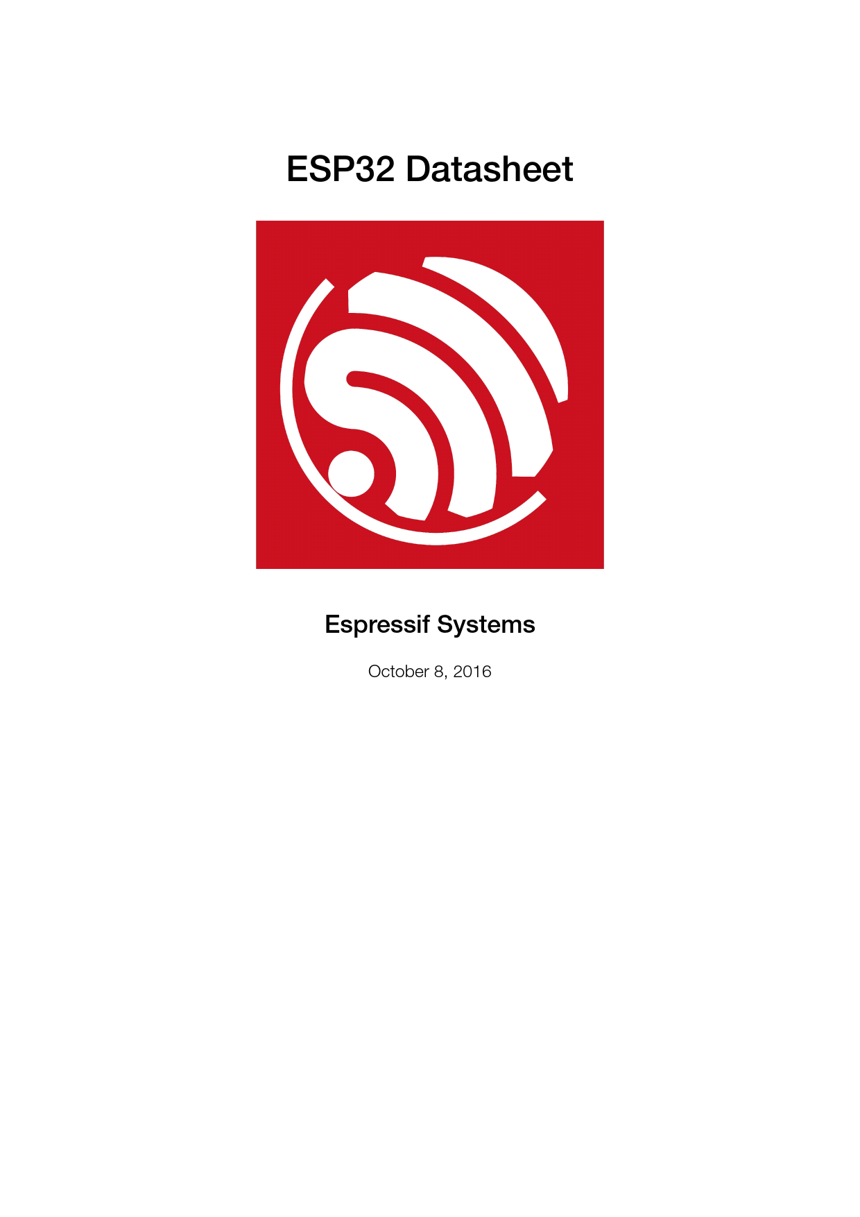 ESP32 Datasheet Espressif Systems October 8, 2016 Document Outline Overview Featured Solutions Ultra Low Power Solution Complete Integration Solution Basic Protocols Wi-Fi Bluetooth MCU and Advanced Features CPU and Memory Clocks and Timers Advanced Peripheral Interfaces Security Development Support Application Block Diagram Pin Definitions Pin Layout Pin Description Power Scheme Strapping Pins Functional Description CPU and Memory CPU Internal Memory External Flash and SRAM Memory Map Timers and Watchdogs 64-bit Timers Watchdog Timers System Clocks CPU Clock RTC Clock Audio PLL Clock Radio 2.4 GHz Receiver 2.4 GHz Transmitter Clock Generator Wi-Fi Wi-Fi Radio and Baseband Wi-Fi MAC Wi-Fi Firmware Packet Traffic Arbitration (PTA) Bluetooth Bluetooth Radio and Baseband Bluetooth Interface Bluetooth Stack Bluetooth Link Controller RTC and Low-Power Management Peripheral Interface General Purpose Input / Output Interface (GPIO) Analog-to-Digital Converter (ADC) Ultra Low Noise Analog Pre-Amplifier Hall Sensor Digital-to-Analog Converter (DAC) Temperature Sensor Touch Sensor Ultra-Lower-Power Coprocessor Ethernet MAC Interface SD/SDIO/MMC Host Controller Universal Asynchronous Receiver Transmitter (UART) I2C Interface I2S Interface Infrared Remote Controller Pulse Counter Pulse Width Modulation (PWM) LED PWM Serial Peripheral Interface (SPI) Accelerator Electrical Characteristics Absolute Maximum Ratings Recommended Operating Conditions RF Power Consumption Specifications Wi-Fi Radio Bluetooth Radio Receiver - Basic Data Rate Transmitter - Basic Data Rate Receiver - Enhanced Data Rate Transmitter - Enhanced Data Rate Bluetooth LE Radio Receiver Transmitter Package Information Supported Resources Related Documentation Community Resources Appendix A - Touch Sensor Appendix B - Code Examples