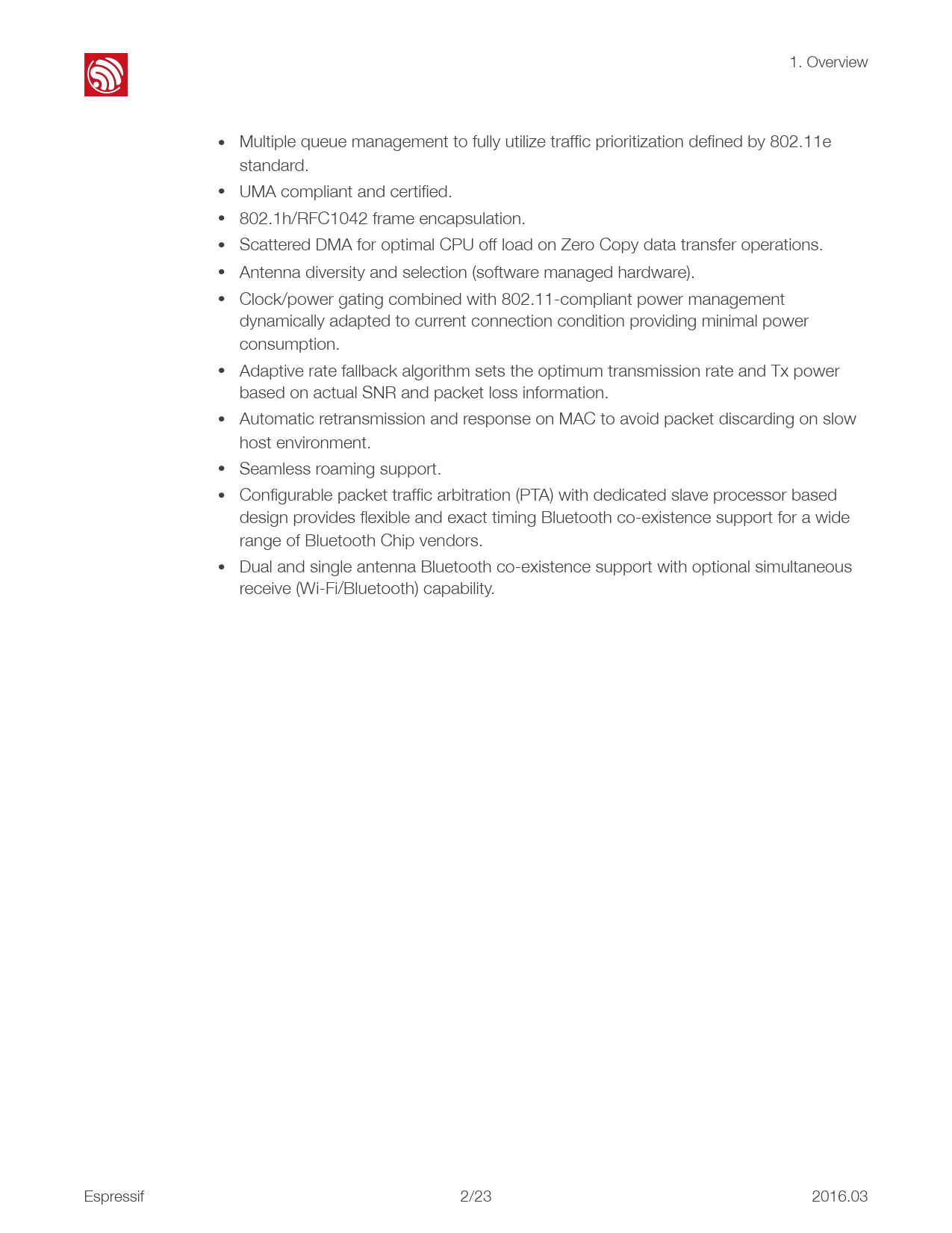 1. Overview ! • Multiple queue management to fully utilize traffic prioritization defined by 802.11e standard. • UMA compliant and certified. • 802.1h/RFC1042 frame encapsulation. • Scattered DMA for optimal CPU off load on Zero Copy data transfer operations. • Antenna diversity and selection (software managed hardware). • Clock/power gating combined with 802.11-compliant power management dynamically adapted to current connection condition providing minimal power consumption. • Adaptive rate fallback algorithm sets the optimum transmission rate and Tx power based on actual SNR and packet loss information. • Automatic retransmission and response on MAC to avoid packet discarding on slow host environment. • Seamless roaming support. • Configurable packet traffic arbitration (PTA) with dedicated slave processor based design provides flexible and exact timing Bluetooth co-existence support for a wide range of Bluetooth Chip vendors. • Dual and single antenna Bluetooth co-existence support with optional simultaneous receive (Wi-Fi/Bluetooth) capability. Espressif ! / 2 !23 2016.03