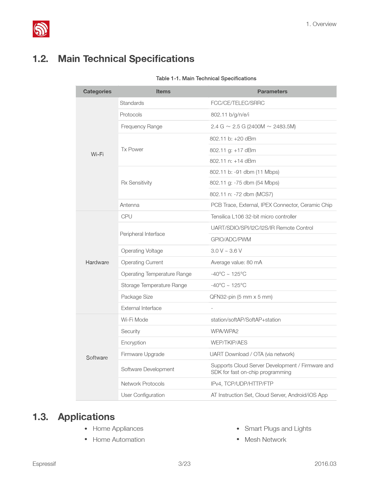 Text Version of Document 1. Overview !1.2. Main Technical Specifications Table 1-1. Main Technical SpecificationsCategories Items Parameters Standards FCC/CE/TELEC/SRRC Protocols 802.11 b/g/n/e/i Frequency Range 2.4 G 2.5 G (2400M 2483.5M) 802.11 b: +20 dBm Tx Power 802.11 g: +17 dBm Wi-Fi 802.11 n: +14 dBm 802.11 b: -91 dbm (11 Mbps) Rx Sensitivity 802.11 g: -75 dbm (54 Mbps) 802.11 n: -72 dbm (MCS7) Antenna PCB Trace, External, IPEX Connector, Ceramic Chip CPU Tensilica L106 32-bit micro controller UART/SDIO/SPI/I2C/I2S/IR Remote Control Peripheral Interface GPIO/ADC/PWM Operating Voltage 3.0 V ~ 3.6 V Hardware Operating Current Average value: 80 mA Operating Temperature Range -40°C ~ 125°C Storage Temperature Range -40°C ~ 125°C Package Size QFN32-pin (5 mm x 5 mm) External Interface - Wi-Fi Mode station/softAP/SoftAP+station Security WPA/WPA2 Encryption WEP/TKIP/AES Firmware Upgrade UART Download / OTA (via network) Software Supports Cloud Server Development / Firmware and Software Development SDK for fast on-chip programming Network Protocols IPv4, TCP/UDP/HTTP/FTP User Configuration AT Instruction Set, Cloud Server, Android/iOS App1.3. Applications