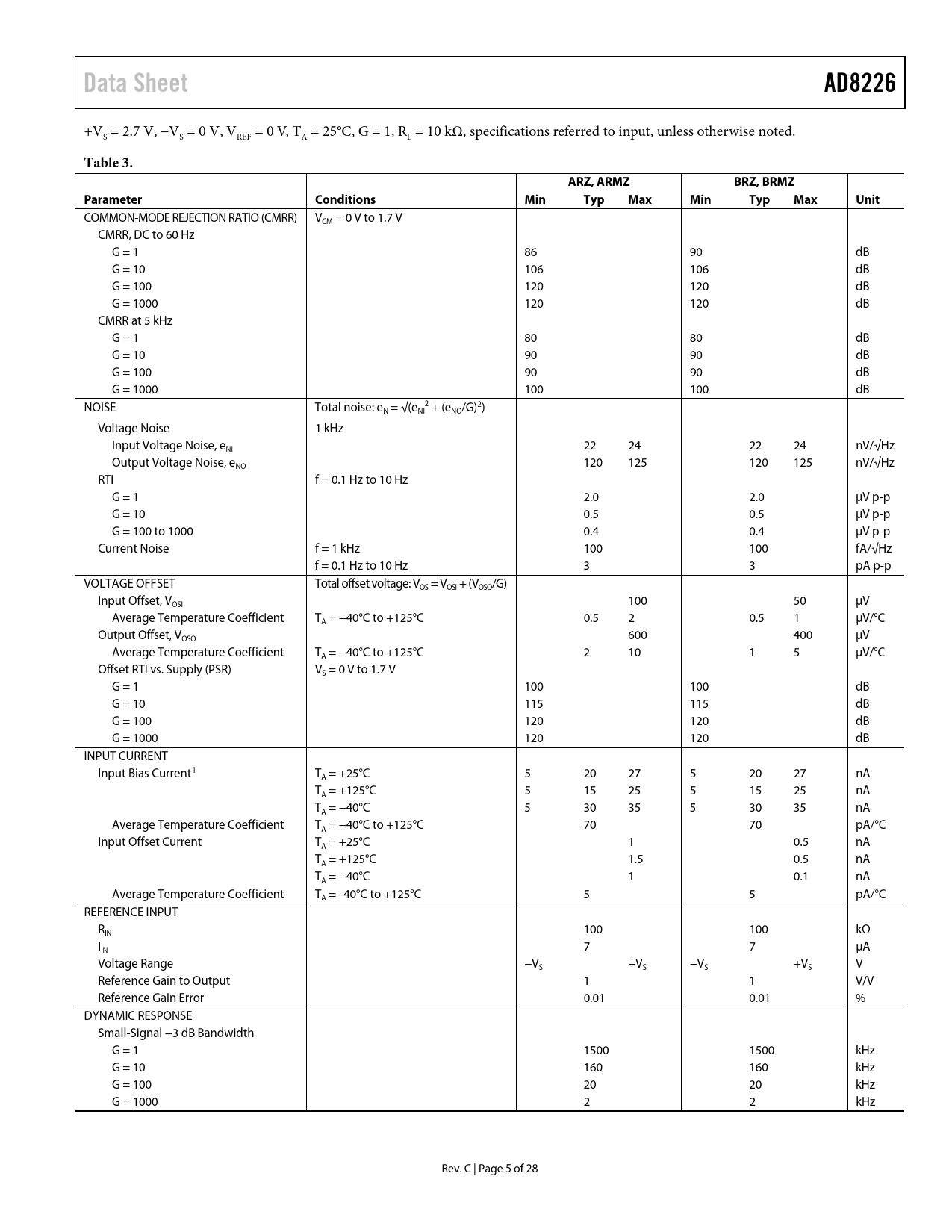 link to page 7 Data SheetAD8226 +VS = 2.7 V, −VS = 0 V, VREF = 0 V, TA = 25°C, G = 1, RL = 10 kΩ, specifications referred to input, unless otherwise noted. Table 3.ARZ, ARMZBRZ, BRMZParameterConditionsMinTypMaxMinTypMaxUnit COMMON-MODE REJECTION RATIO (CMRR) VCM = 0 V to 1.7 V CMRR, DC to 60 Hz G = 1 86 90 dB G = 10 106 106 dB G = 100 120 120 dB G = 1000 120 120 dB CMRR at 5 kHz G = 1 80 80 dB G = 10 90 90 dB G = 100 90 90 dB G = 1000 100 100 dB NOISE Total noise: e 2 N = √(eNI + (eNO/G)2) Voltage Noise 1 kHz Input Voltage Noise, eNI 22 24 22 24 nV/√Hz Output Voltage Noise, eNO 120 125 120 125 nV/√Hz RTI f = 0.1 Hz to 10 Hz G = 1 2.0 2.0 µV p-p G = 10 0.5 0.5 µV p-p G = 100 to 1000 0.4 0.4 µV p-p Current Noise f = 1 kHz 100 100 fA/√Hz f = 0.1 Hz to 10 Hz 3 3 pA p-p VOLTAGE OFFSET Total offset voltage: VOS = VOSI + (VOSO/G) Input Offset, VOSI 100 50 µV Average Temperature Coefficient TA = −40°C to +125°C 0.5 2 0.5 1 µV/°C Output Offset, VOSO 600 400 µV Average Temperature Coefficient TA = −40°C to +125°C 2 10 1 5 µV/°C Offset RTI vs. Supply (PSR) VS = 0 V to 1.7 V G = 1 100 100 dB G = 10 115 115 dB G = 100 120 120 dB G = 1000 120 120 dB INPUT CURRENT Input Bias Current1 TA = +25°C 5 20 27 5 20 27 nA TA = +125°C 5 15 25 5 15 25 nA TA = −40°C 5 30 35 5 30 35 nA Average Temperature Coefficient TA = −40°C to +125°C 70 70 pA/°C Input Offset Current TA = +25°C 1 0.5 nA TA = +125°C 1.5 0.5 nA TA = −40°C 1 0.1 nA Average Temperature Coefficient TA =−40°C to +125°C 5 5 pA/°C REFERENCE INPUT RIN 100 100 kΩ IIN 7 7 µA Voltage Range −VS +VS −VS +VS V Reference Gain to Output 1 1 V/V Reference Gain Error 0.01 0.01 % DYNAMIC RESPONSE Small-Signal −3 dB Bandwidth G = 1 1500 1500 kHz G = 10 160 160 kHz G = 100 20 20 kHz G = 1000 2 2 kHz Rev. C | Page 5 of 28 Document Outline Features Applications Pin Configuration General Description Revision History Specifications Absolute Maximum Ratings Thermal Resistance ESD Caution Pin Configuration and Function Descriptions Typical Performance Characteristics Theory of Operation Architecture Gain Selection Reference Terminal Input Voltage Range Performance Across Temperature Recommendation for Best Performance Layout Common-Mode Rejection Ratio Over Frequency Power Supplies References Input Bias Current Return Path Input Protection Radio Frequency Interference (RFI) Applications Information Differential Drive Tips for Best Differential Output Performance Precision Strain Gage Driving an ADC Outline Dimensions Ordering Guide