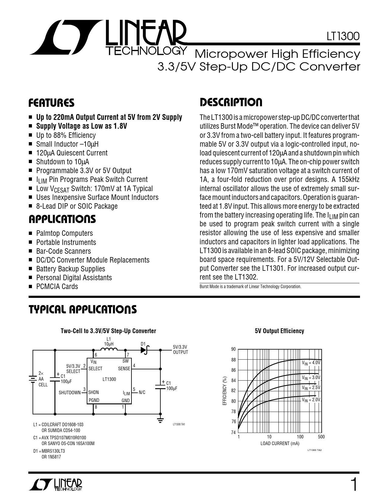 LT1300 Micropower High Efficiency 3.3/5V Step-Up DC/DC Converter