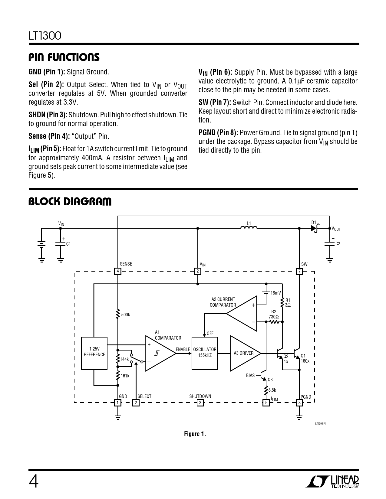 VIN L1 D1 VOUT + + C1 C2 SENSE VIN SW 4 2 7 18mV A2 CURRENT R1 COMPARATOR + 3Ω R2 500k 730Ω – A1 OFF COMPARATOR + 1.25V ENABLE OSCILLATOR REFERENCE A3 DRIVER 155kHZ Q2 Q1 144k – 1x 160x 161k BIAS Q3 8.5k GND SELECT SHUTDOWN I PGND LIM 1 2 3 5 8 LT1300 F1