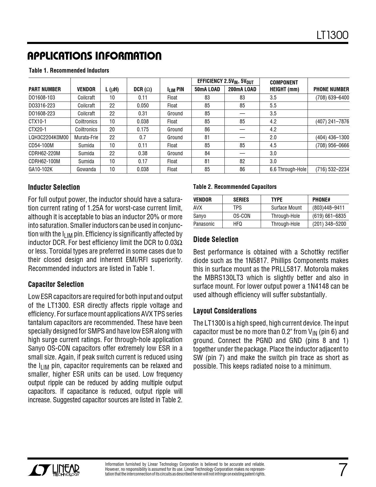 LT1300 UUWUAPPLICATIONS INFORMATIONTable 1. Recommended InductorsEFFICIENCY 2.5VIN, 5VOUTCOMPONENTPART NUMBERVENDORL ( µ H)DCR ( Ω )ILIM PIN50mA LOAD200mA LOADHEIGHT (mm)PHONE NUMBER DO1608-103 Coilcraft 10 0.11 Float 83 83 3.5 (708) 639–6400 DO3316-223 Coilcraft 22 0.050 Float 85 85 5.5 DO1608-223 Coilcraft 22 0.31 Ground 85 — 3.5 CTX10-1 Coiltronics 10 0.038 Float 85 85 4.2 (407) 241–7876 CTX20-1 Coiltronics 20 0.175 Ground 86 — 4.2 LQH3C2204K0M00 Murata-Frie 22 0.7 Ground 81 — 2.0 (404) 436–1300 CD54-100M Sumida 10 0.11 Float 85 85 4.5 (708) 956–0666 CDRH62-220M Sumida 22 0.38 Ground 84 — 3.0 CDRH62-100M Sumida 10 0.17 Float 81 82 3.0 GA10-102K Gowanda 10 0.038 Float 85 86 6.6 Through-Hole (716) 532–2234 Inductor SelectionTable 2. Recommended Capacitors For full output power, the inductor should have a satura- VENDORSERIESTYPEPHONE# tion current rating of 1.25A for worst-case current limit, AVX TPS Surface Mount (803)448–9411 although it is acceptable to bias an inductor 20% or more Sanyo OS-CON Through-Hole (619) 661–6835 into saturation. Smaller inductors can be used in conjunc- Panasonic HFQ Through-Hole (201) 348–5200 tion with the ILIM pin. Efficiency is significantly affected by inductor DCR. For best efficiency limit the DCR to 0.03Ω Diode Selection or less. Toroidal types are preferred in some cases due to Best performance is obtained with a Schottky rectifier their closed design and inherent EMI/RFI superiority. diode such as the 1N5817. Phillips Components makes Recommended inductors are listed in Table 1. this in surface mount as the PRLL5817. Motorola makes the MBRS130LT3 which is slightly better and also in Capacitor Selection surface mount. For lower output power a 1N4148 can be Low ESR capacitors are required for both input and output used although efficiency will suffer substantially. of the LT1300. ESR directly affects ripple voltage and efficiency. For surface mount applications AVX TPS series Layout Considerations tantalum capacitors are recommended. These have been The LT1300 is a high speed, high current device. The input specially designed for SMPS and have low ESR along with capacitor must be no more than 0.2" from VIN (pin 6) and high surge current ratings. For through-hole application ground. Connect the PGND and GND (pins 8 and 1) Sanyo OS-CON capacitors offer extremely low ESR in a together under the package. Place the inductor adjacent to small size. Again, if peak switch current is reduced using SW (pin 7) and make the switch pin trace as short as the ILIM pin, capacitor requirements can be relaxed and possible. This keeps radiated noise to a minimum. smaller, higher ESR units can be used. Low frequency output ripple can be reduced by adding multiple output capacitors. If capacitance is reduced, output ripple will increase. Suggested capacitor sources are listed in Table 2. Information furnished by Linear Technology Corporation is believed to be accurate and reliable. However, no responsibility is assumed for its use. Linear Technology Corporation makes no represen- tation that the interconnection of its circuits as described herein will not infringe on existing patent rights. 7