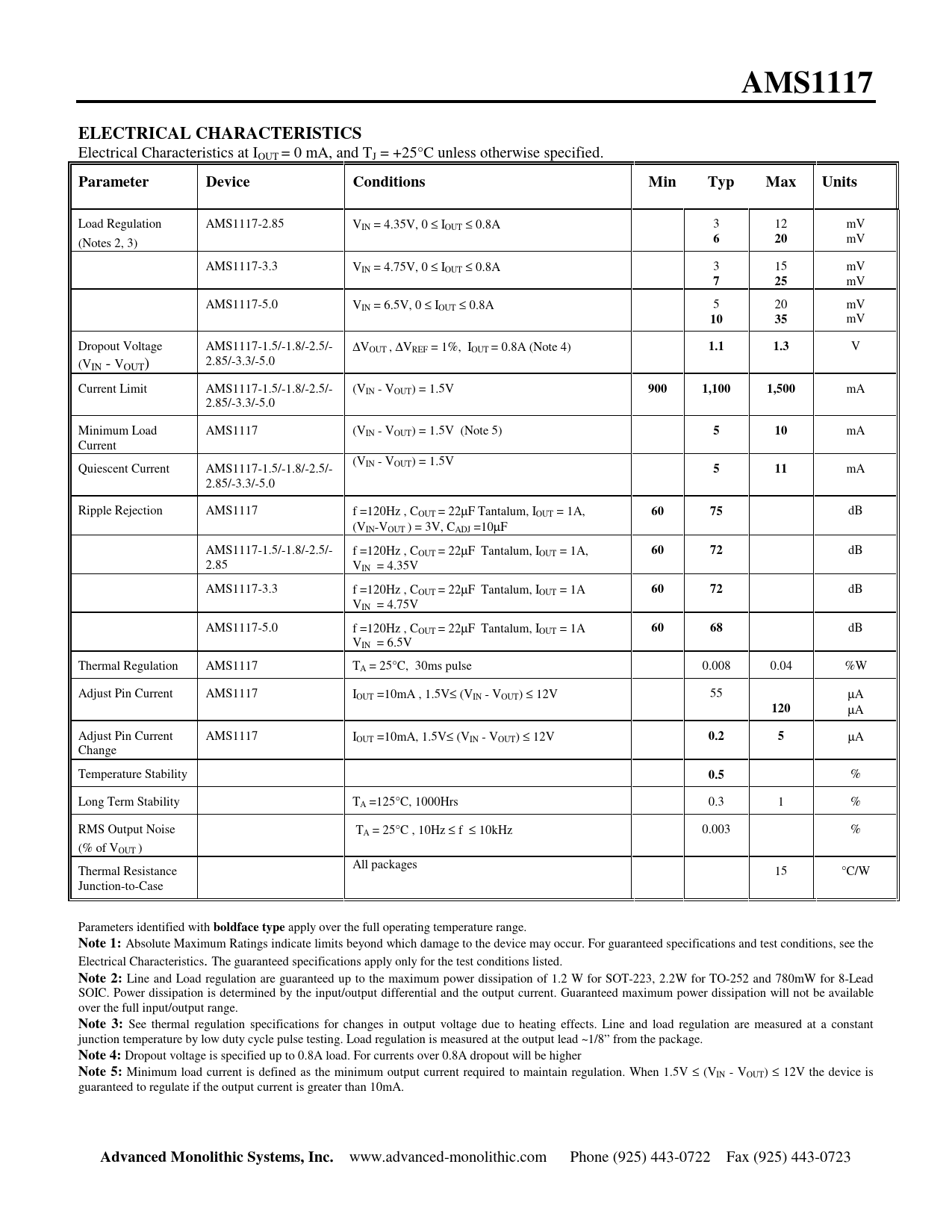 AMS1117 ELECTRICAL CHARACTERISTICS