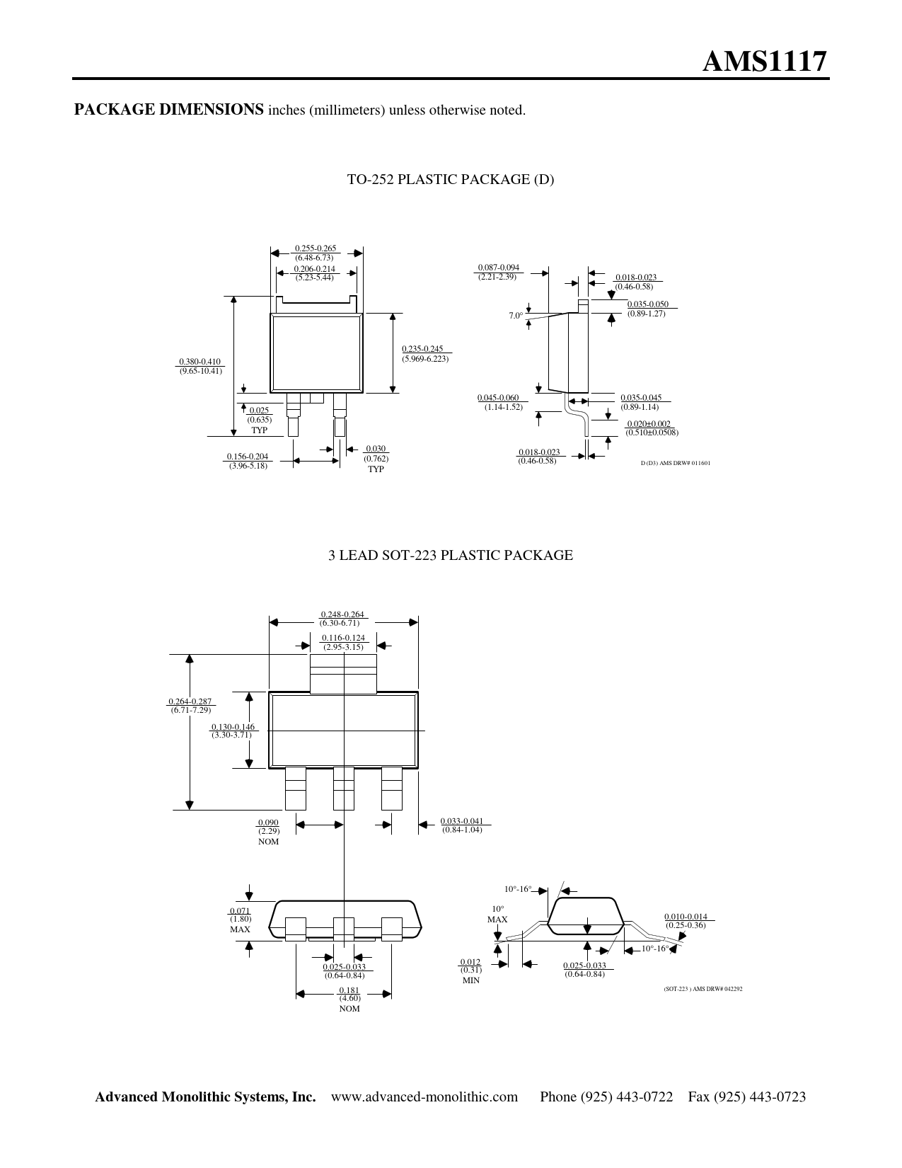 inches (millimeters) unless otherwise noted. TO-252 PLASTIC PACKAGE (D) 0.255-0.265 (6.48-6.73) 0.206-0.214 0.087-0.094 (5.23-5.44) (2.21-2.39) 0.018-0.023 (0.46-0.58) 0.035-0.050 (0.89-1.27) 7.0° 0.235-0.245 (5.969-6.223) 0.380-0.410 (9.65-10.41) 0.045-0.060 0.035-0.045 (1.14-1.52) (0.89-1.14) 0.025 (0.635) 0.020±0.002 TYP (0.510±0.0508) 0.030 0.018-0.023 0.156-0.204 (0.762) (0.46-0.58) D (D3) AMS DRW# 011601 (3.96-5.18) TYP 3 LEAD SOT-223 PLASTIC PACKAGE 0.248-0.264 (6.30-6.71) 0.116-0.124 (2.95-3.15) 0.264-0.287 (6.71-7.29) 0.130-0.146 (3.30-3.71) 0.090 0.033-0.041 (2.29) (0.84-1.04) NOM 10°-16° 0.071 10° (1.80) MAX 0.010-0.014 (0.25-0.36) MAX 10°-16° 0.012 0.025-0.033 0.025-0.033 (0.31) (0.64-0.84) (0.64-0.84) MIN 0.181 (SOT-223 ) AMS DRW# 042292 (4.60) NOM