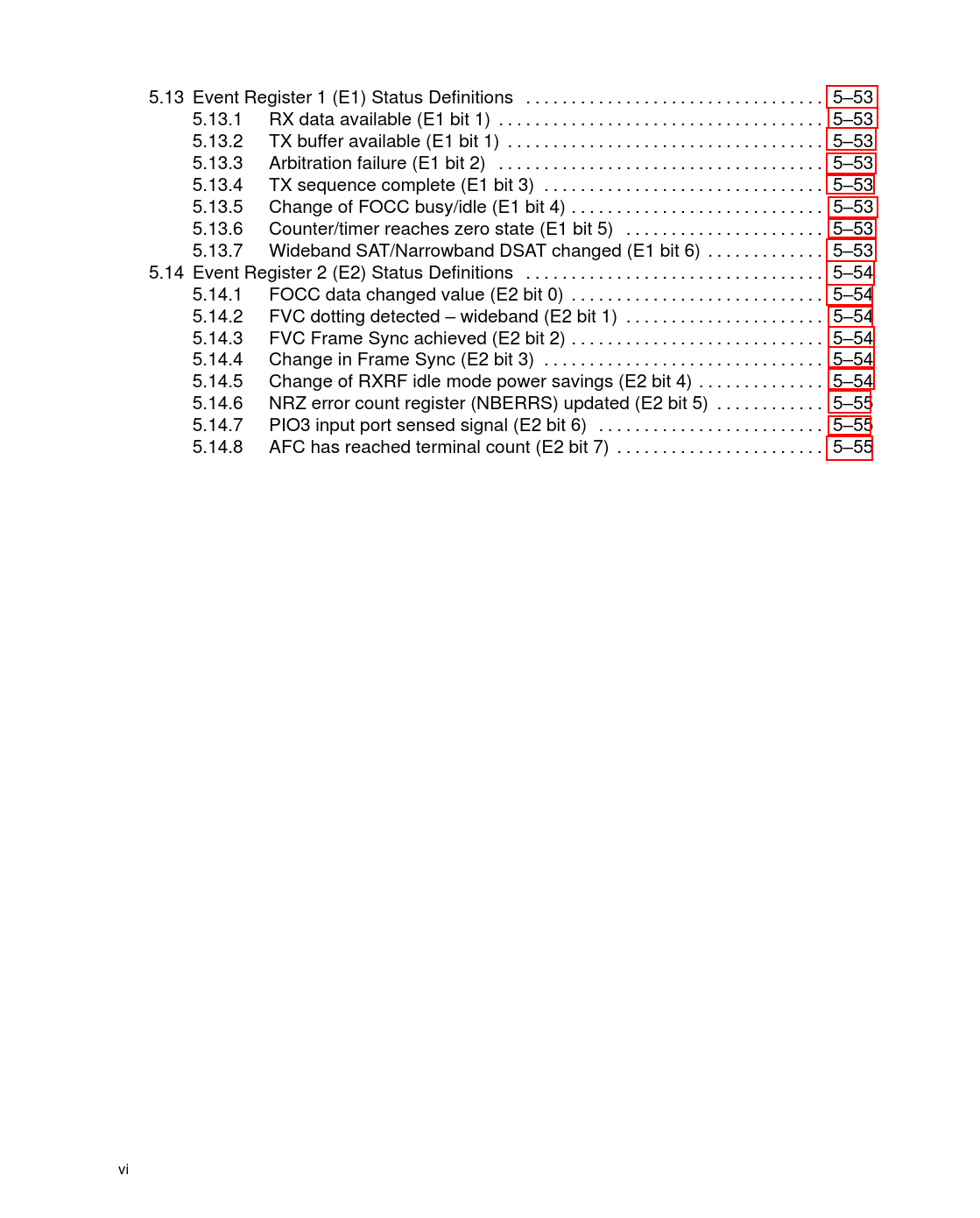 link to page 89 link to page 89 link to page 89 link to page 89 link to page 89 link to page 89 link to page 89 link to page 89 link to page 90 link to page 90 link to page 90 link to page 90 link to page 90 link to page 90 link to page 91 link to page 91 link to page 91 5.13 Event Register 1 (E1) Status Definitions . 5–53 5.13.1 RX data available (E1 bit 1) . 5–53 5.13.2 TX buffer available (E1 bit 1) . 5–53 5.13.3 Arbitration failure (E1 bit 2) . 5–53 5.13.4 TX sequence complete (E1 bit 3) . 5–53 5.13.5 Change of FOCC busy/idle (E1 bit 4) . 5–53 5.13.6 Counter/timer reaches zero state (E1 bit 5) . 5–53 5.13.7 Wideband SAT/Narrowband DSAT changed (E1 bit 6) . 5–53 5.14 Event Register 2 (E2) Status Definitions . 5–54 5.14.1 FOCC data changed value (E2 bit 0) . 5–54 5.14.2 FVC dotting detected – wideband (E2 bit 1) . 5–54 5.14.3 FVC Frame Sync achieved (E2 bit 2) . 5–54 5.14.4 Change in Frame Sync (E2 bit 3) . 5–54 5.14.5 Change of RXRF idle mode power savings (E2 bit 4) . 5–54 5.14.6 NRZ error count register (NBERRS) updated (E2 bit 5) . 5–55 5.14.7 PIO3 input port sensed signal (E2 bit 6) . 5–55 5.14.8 AFC has reached terminal count (E2 bit 7) . 5–55 vi Document Outline IMPORTANT NOTICE Contents List of Illustrations List of Tables Introduction TCM8030 Features Data Processing Features Audio Processing Features Functional Block Diagram Terminal Assignments Terminal Functions Electrical Specifications Absolute Maximum Ratings Over Operating Free-Air Temperature Range (se\ e Note 1) Recommended Operating Conditions Electrical Characteristics Over Recommended Range of Supply Voltages an\ d Operating Conditions (unless otherwise noted) Electrical Characteristics Over Recommended Operating Conditions, V=3.0\ V, clocked by a crystal oscillator at 5.12 MHz DIGITAL I/Os, V = 3 V Transmit Path Specifications, V = 2.7 V to 3.3 V MICAMP1 and MICAMP2 Voice and DTMF (V/D) Trim, MIC1 to TXO COMPRESSOR, MIC1 to TXO LIMITER, MIC1 to TXO TXTRIM, MIC1 to TXO Transmit Path, MIC1 to TXO Transmit Data at TXO TX-DAT TRIM at TXO Transmit SAT at TXO SAT TRIM at TXO Receive Path Specifications, V = 2.7 V to 3.3 V, V= 171.2 mVrms RXAMP RXTRIM, RXGAIN to REC1 EXPANDOR, RXGAIN to REC1 Receive Path, RXGAIN to REC1 VOL CTRL, RXGAIN to REC1 LS DRIVER, at RECP and RECN, Input at RECIN Receive Data Detect, V = 3 V Receive SAT Detect Miscellaneous Block Specifications, V = 3 V DD 2.6.1 Digital-to-Analog Converters DAC1, DAC2, and DAC3 TCXO Amplifier IF Amplifier DTMF Generator AMP7 Timing Requirements Over Recommended Ranges of Operating Conditions (s\ ee Figure 3…1) Parameter Measurement Information Typical Characteristics Principles of Operation Overview Receive Audio Path Transmit Audio Path Data Processor Miscellaneous Circuits Clocks Power Modes Total Power-Down Mode Shutdown Mode Idle Mode Tone Mode Full Operation Mode, DTMF TX Off Full Operation Mode, DTMF TX On Independent Circuits Circuit Definitions Transmit Path Audio Processing Functions Receive Path Audio Processing Functions Transmit Path Data Processing Functions Receive Path Data Processing Functions Transmit Path SAT Processing Functions Receive Path SAT Processing Functions Miscellaneous Functions Microcontroller Interface Operation Microcontroller Write Operation Address 00 - Operational Control Word 1 (C1) Address 01 - DCC/SAT/DSAT Control Word (C2) Address 02 - Signal Polarity Selection (C3) Address 03 - Master Power Enable Modes (C4) Address 04 - FOCC/FVC Optional Controls (C5) Address 05 - Interrupt Control Word 1 (IE1) Address 06 - Interrupt Control Word 2 (IE2) Address 08 - Commence TX (TXSTART) Address 09 - Start Watchdog (WDSTART) Address 0A - Abort TX (TXABORT) Address 0B - Clear TX Buffer (TXCLEAR) Address 0C - Restart Frame Sync (FRAMESYNC) Address 0D - Reset (RST) Address 0E - Reset Arbitration (ARBITRST) Address 10 - TX Data Word 0 (TXD0) Address 11 - TX Data Word 1 (TXD1) Address 12 - TX Data Word 2 (TXD2) Address 13 - TX Data Word 3 (TXD3) Address 14 - TX Data Word 4 (TXD4) Addresses 15, 17, 19 - PIO Control Words (PIOC1, PIOC2, PIOC3) Addresses 16, 18, 1A - PIO Output Words (PO1, PO2, PO3) Address 1B - PIO3 Pullup Enable Transistors (PI3PULL) Address 1C - PIO3 Interrupt Control (PI3INT) Address 20 - RXRF Idle Mode Timer (RXRFTIM) Address 21 - Counter/Timer Coef (TIMER) Address 22 - Mismatch Wideband Address 23 - FOCC Dotting Coefficient (FCCDOT) - Wideband Address 24 - FVC Dotting Coefficient (FVCDOT) - Wideband Address 25 - Allowed Narrowband Errors (NBCOEF) - Narrowband Address 26 - SAT Lock Determination (SATCOEF) - Wideband Address 2E - Data Processor Test Control 1 (DTEST1) Address 30 - Auxiliary Power Enable (AUXPE) Register Address 31 - Clock Source Frequency Select (CLKSRC) Address 32 - Receive-Audio Path Configuration (RXCFG) Address 33 - Transmit-Audio Path Configuration (TXCFG) Address 34 - Microphone and TX DTMF Trim (VDTRIM) Address 35 - Limiter Trim (LIMITER) Address 36 - Transmit SAT Trim (SAT TRIM) Address 37 - Transmit Data Trim (TXDATRIM) Address 38 - Transmit Trim (TXTRIM) Address 39 - Receive Trim (RXTRIM) Address 3A - Loudspeaker Volume Control (VOL CTRL) Address 3B - DTMF Control (DTMFCTRL) Address 3C - Analog Test Modes (ATEST) Address 40 - DAC Range Select (DACRANGE) Address 41 - DAC1 Data (DAC1DAT) Address 42 - DAC2 Data (DAC2DAT) Address 43 - DAC3 Data (DAC3DAT) Address 44 - AFC control (AFCCTRL) Read Operation Address 00 - Status Word 1 Register (S1) Address 01 - Status Word 2 Register (S2) Address 05 - Event Register 1 (E1) Address 06 - Event Register 2 (E2) Address 10 - RX Data Word 0 (RXD0) Address 11 - RX Data Word 1 (RXD1) Address 12 - RX Data Word 2 (RXD2) Address 13 - RX Data Word 3 (RXD3) Addresses 16, 18, 1A - PIO Status Words (PI1, PI2, PI3) Address 22 - RX Repeat Count (RXRPT)- Wideband Address 25 - Narrowband Error Rate (NBERRS) Address 43 - AFC Terminal Count MS Byte (AFCIF1) Address 44 - AFC Terminal Count Middle Byte (AFCIF2) Address 45 - AFC Terminal Count