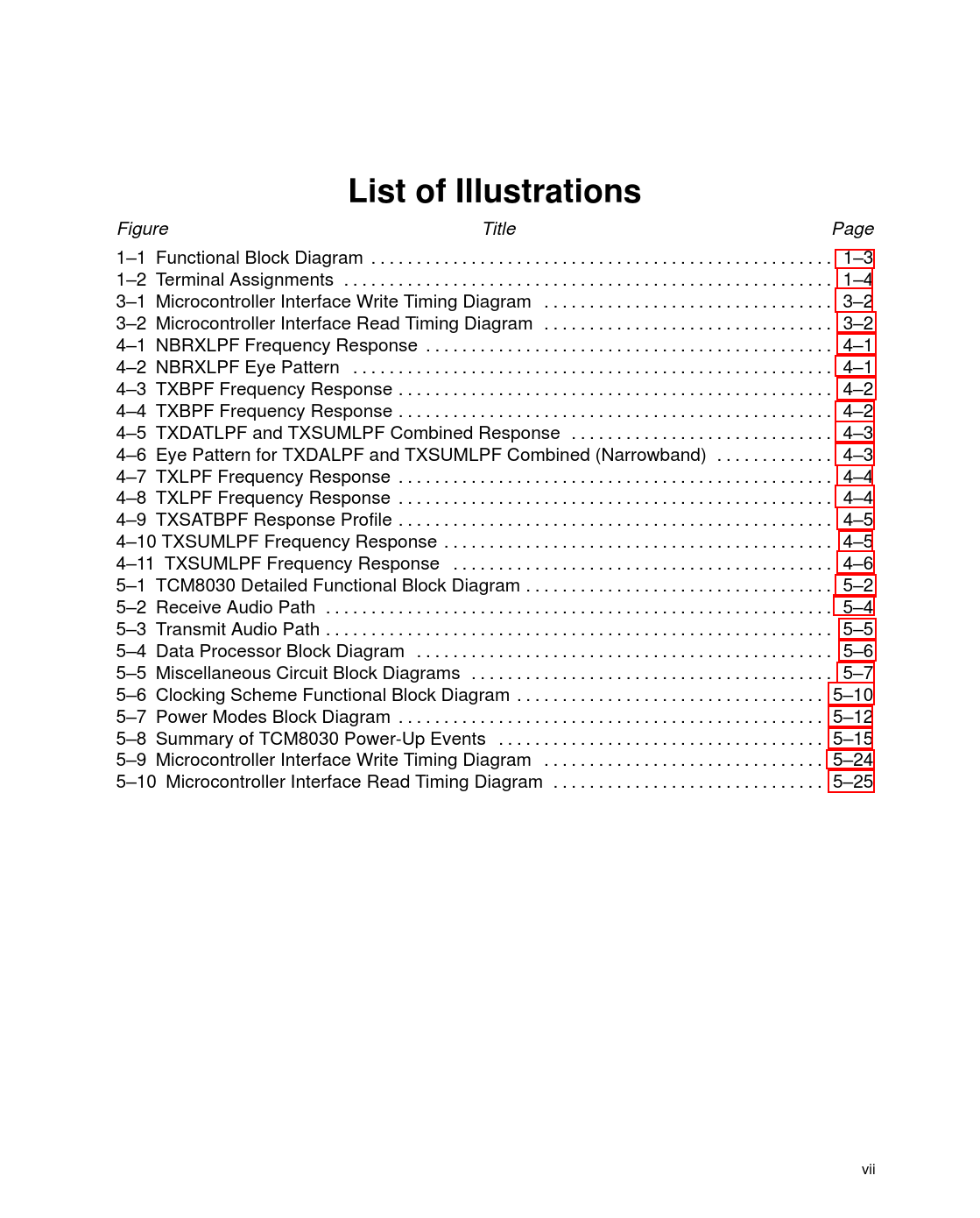 link to page 12 link to page 13 link to page 30 link to page 30 link to page 31 link to page 31 link to page 32 link to page 32 link to page 33 link to page 33 link to page 34 link to page 34 link to page 35 link to page 35 link to page 36 link to page 38 link to page 40 link to page 41 link to page 42 link to page 43 link to page 46 link to page 48 link to page 51 link to page 60 link to page 61 List of Illustrations Figure Title Page 1–1 Functional Block Diagram . 1–3 1–2 Terminal Assignments . 1–4 3–1 Microcontroller Interface Write Timing Diagram . 3–2 3–2 Microcontroller Interface Read Timing Diagram . 3–2 4–1 NBRXLPF Frequency Response . 4–1 4–2 NBRXLPF Eye Pattern . 4–1 4–3 TXBPF Frequency Response . 4–2 4–4 TXBPF Frequency Response . 4–2 4–5 TXDATLPF and TXSUMLPF Combined Response . 4–3 4–6 Eye Pattern for TXDALPF and TXSUMLPF Combined (Narrowband) . 4–3 4–7 TXLPF Frequency Response . 4–4 4–8 TXLPF Frequency Response . 4–4 4–9 TXSATBPF Response Profile . 4–5 4–10 TXSUMLPF Frequency Response . 4–5 4–11 TXSUMLPF Frequency Response . 4–6 5–1 TCM8030 Detailed Functional Block Diagram . 5–2 5–2 Receive Audio Path . 5–4 5–3 Transmit Audio Path . 5–5 5–4 Data Processor Block Diagram . 5–6 5–5 Miscellaneous Circuit Block Diagrams . 5–7 5–6 Clocking Scheme Functional Block Diagram . 5–10 5–7 Power Modes Block Diagram . 5–12 5–8 Summary of TCM8030 Power-Up Events . 5–15 5–9 Microcontroller Interface Write Timing Diagram . 5–24 5–10 Microcontroller Interface Read Timing Diagram . 5–25 vii Document Outline IMPORTANT NOTICE Contents List of Illustrations List of Tables Introduction TCM8030 Features Data Processing Features Audio Processing Features Functional Block Diagram Terminal Assignments Terminal Functions Electrical Specifications Absolute Maximum Ratings Over Operating Free-Air Temperature Range (se\ e Note 1) Recommended Operating Conditions Electrical Characteristics Over Recommended Range of Supply Voltages an\ d Operating Conditions (unless otherwise noted) Electrical Characteristics Over Recommended Operating Conditions, V=3.0\ V, clocked by a crystal oscillator at 5.12 MHz DIGITAL I/Os, V = 3 V Transmit Path Specifications, V = 2.7 V to 3.3 V MICAMP1 and MICAMP2 Voice and DTMF (V/D) Trim, MIC1 to TXO COMPRESSOR, MIC1 to TXO LIMITER, MIC1 to TXO TXTRIM, MIC1 to TXO Transmit Path, MIC1 to TXO Transmit Data at TXO TX-DAT TRIM at TXO Transmit SAT at TXO SAT TRIM at TXO Receive Path Specifications, V = 2.7 V to 3.3 V, V= 171.2 mVrms RXAMP RXTRIM, RXGAIN to REC1 EXPANDOR, RXGAIN to REC1 Receive Path, RXGAIN to REC1 VOL CTRL, RXGAIN to REC1 LS DRIVER, at RECP and RECN, Input at RECIN Receive Data Detect, V = 3 V Receive SAT Detect Miscellaneous Block Specifications, V = 3 V DD 2.6.1 Digital-to-Analog Converters DAC1, DAC2, and DAC3 TCXO Amplifier IF Amplifier DTMF Generator AMP7 Timing Requirements Over Recommended Ranges of Operating Conditions (s\ ee Figure 3…1) Parameter Measurement Information Typical Characteristics Principles of Operation Overview Receive Audio Path Transmit Audio Path Data Processor Miscellaneous Circuits Clocks Power Modes Total Power-Down Mode Shutdown Mode Idle Mode Tone Mode Full Operation Mode, DTMF TX Off Full Operation Mode, DTMF TX On Independent Circuits Circuit Definitions Transmit Path Audio Processing Functions Receive Path Audio Processing Functions Transmit Path Data Processing Functions Receive Path Data Processing Functions Transmit Path SAT Processing Functions Receive Path SAT Processing Functions Miscellaneous Functions Microcontroller Interface Operation Microcontroller Write Operation Address 00 - Operational Control Word 1 (C1) Address 01 - DCC/SAT/DSAT Control Word (C2) Address 02 - Signal Polarity Selection (C3) Address 03 - Master Power Enable Modes (C4) Address 04 - FOCC/FVC Optional Controls (C5) Address 05 - Interrupt Control Word 1 (IE1) Address 06 - Interrupt Control Word 2 (IE2) Address 08 - Commence TX (TXSTART) Address 09 - Start Watchdog (WDSTART) Address 0A - Abort TX (TXABORT) Address 0B - Clear TX Buffer (TXCLEAR) Address 0C - Restart Frame Sync (FRAMESYNC) Address 0D - Reset (RST) Address 0E - Reset Arbitration (ARBITRST) Address 10 - TX Data Word 0 (TXD0) Address 11 - TX Data Word 1 (TXD1) Address 12 - TX Data Word 2 (TXD2) Address 13 - TX Data Word 3 (TXD3) Address 14 - TX Data Word 4 (TXD4) Addresses 15, 17, 19 - PIO Control Words (PIOC1, PIOC2, PIOC3) Addresses 16, 18, 1A - PIO Output Words (PO1, PO2, PO3) Address 1B - PIO3 Pullup Enable Transistors (PI3PULL) Address 1C - PIO3 Interrupt Control (PI3INT) Address 20 - RXRF Idle Mode Timer (RXRFTIM) Address 21 - Counter/Timer Coef (TIMER) Address 22 - Mismatch Wideband Address 23 - FOCC Dotting Coefficient (FCCDOT) - Wideband Address 24 - FVC Dotting Coefficient (FVCDOT) - Wideband Address 25 - Allowed Narrowband Errors (NBCOEF) - Narrowband Address 26 - SAT Lock Determination (SATCOEF) - Wideband Address 2E - Data Processor Test Control 1 (DTEST1) Address 30 - Auxiliary Power Enable (AUXPE) Register Address 31 - Clock Source Frequency Select (CLKSRC) Address 32 - Receive-Audio Path Configuration (RXCFG) Address 33 - Transmit-Audio Path Configuration (TXCFG) Address 34 - Microphone and TX DTMF Trim (VDTRIM) Address 35 - Limiter Trim (LIMITER) Address 36 - Transmit SAT Trim (SAT TRIM) Address 37 - Transmit Data Trim (TXDATRIM) Address 38 - Transmit Trim (TXTRIM) Address 39 - Receive Trim (RXTRIM) Address 3A - Loudspeaker Volume Control (VOL CTRL) Address 3B - DTMF Control (DTMFCTRL) Address 3C - Analog Test Modes (ATEST) Address 40 - DAC Range Select (DACRANGE) Address 41 - DAC1 Data (DAC1DAT) Address 42 - DAC2 Data (DAC2DAT) Address 43 - DAC3 Data (DAC3DAT) Address 44 - AFC control (AFCCTRL) Read Operation Address 00 - Status Word 1 Register (S1) Address 01 - Status Word 2 Register (S2) Address 05 - Event Register 1 (E1) Address 06 - Event Register 2 (E2) Address 10 - RX Da