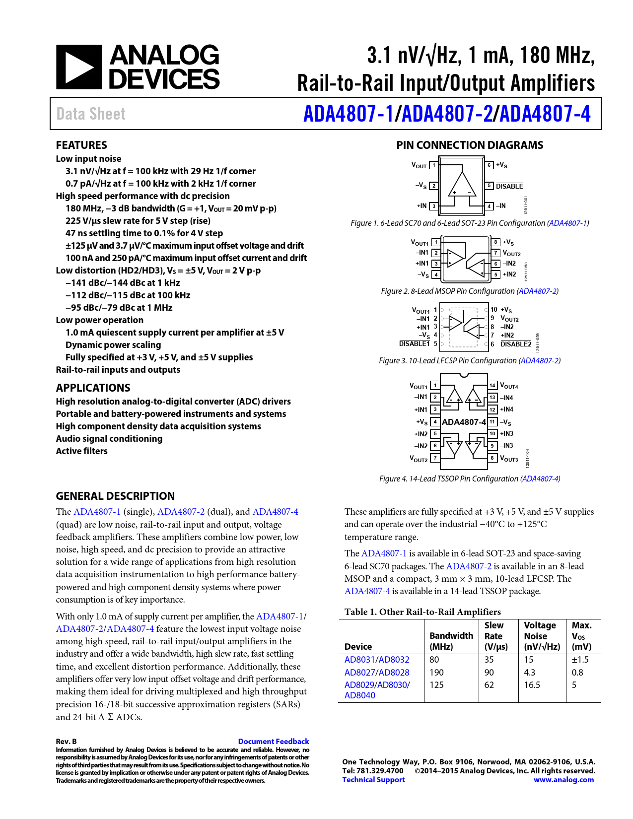 3.1 nV/√Hz, 1 mA, 180 MHz,. Rail-to-Rail Input/Output Amplifiers. Data Sheet. ADA4807-1/. ADA4807-2/. ADA4807-4. FEATURES