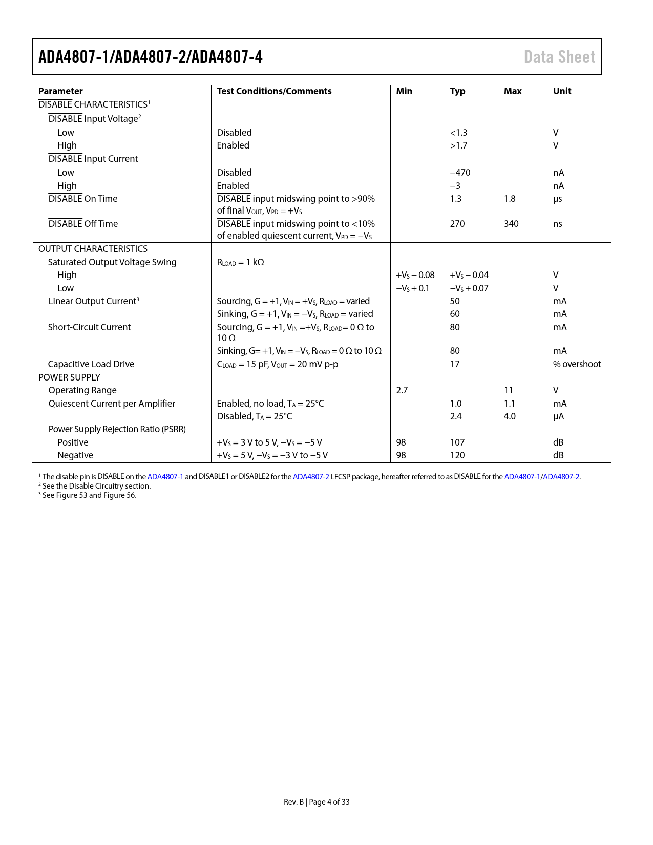 ADA4807-1/ADA4807-2/ADA4807-4 Data Sheet Parameter Test Conditions/Comments Min Typ Max Unit