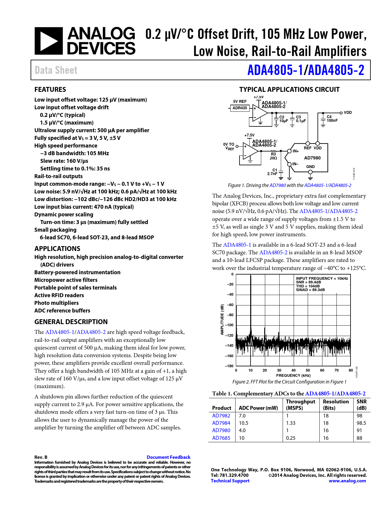0.2 µV/°C Offset Drift, 105 MHz Low Power,. Low Noise, Rail-to-Rail Amplifiers. Data Sheet. ADA4805-1. /ADA4805-2. FEATURES