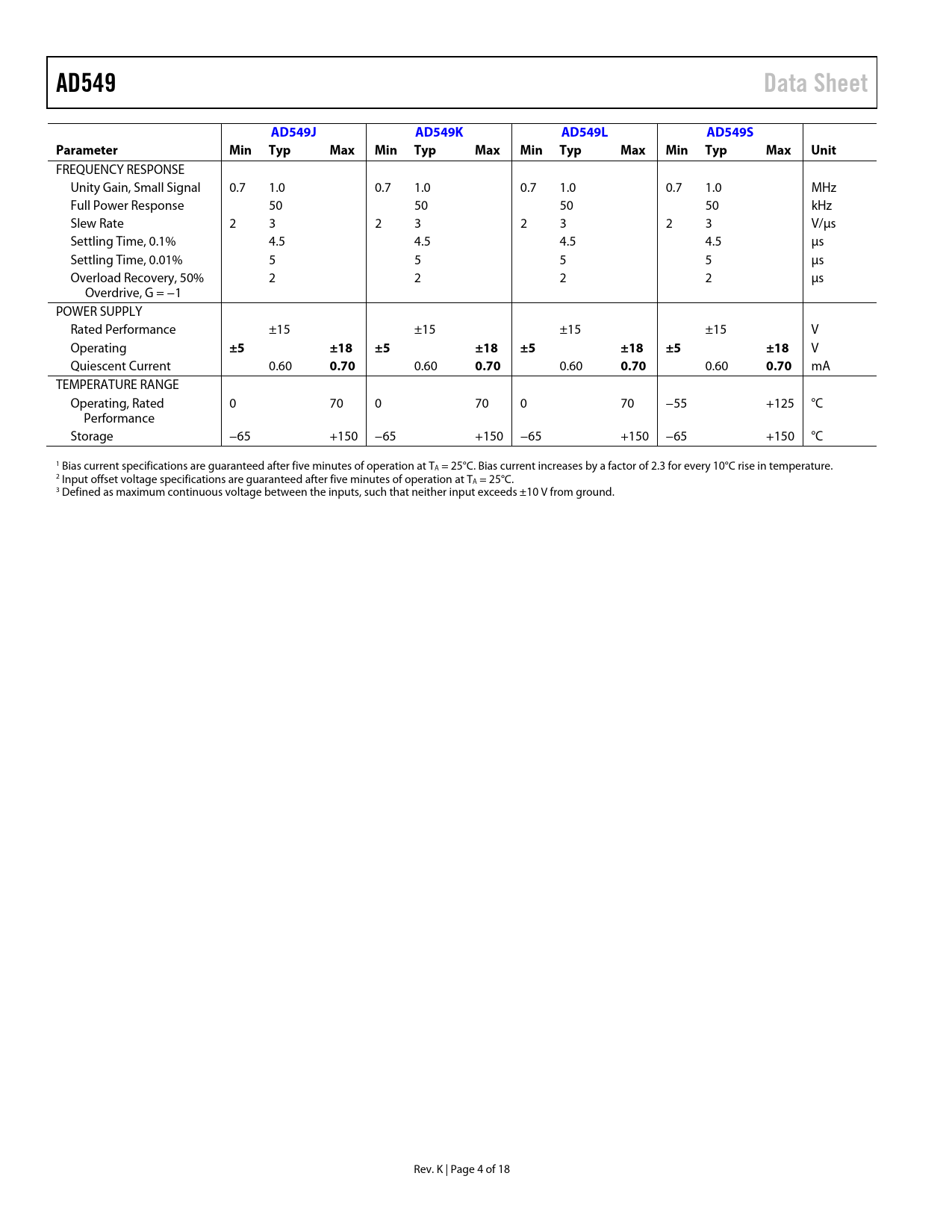 AD549 Data Sheet AD549J AD549K AD549L AD549S Parameter Min Typ Max Min Typ Max Min Typ Max Min Typ Max Unit