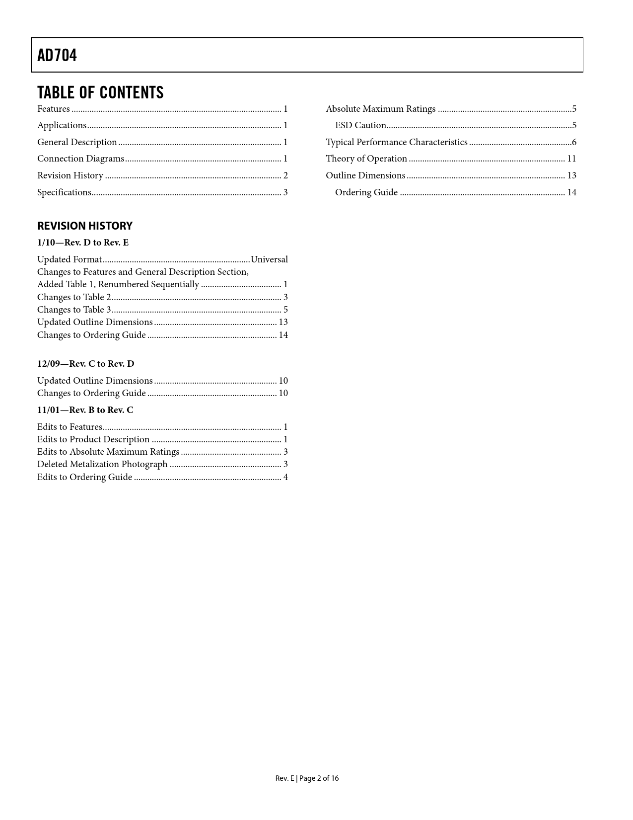 AD704. TABLE OF CONTENTS. REVISION HISTORY 1/10—Rev. D to Rev. E. 12/09—Rev. C to Rev. D. 11/01—Rev. B to Rev. C