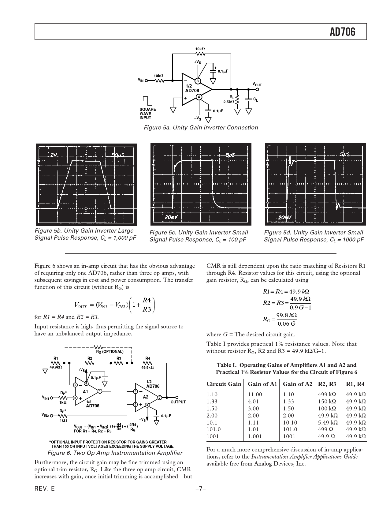 Figure 5a. Unity Gain Inverter Connection Figure 5b. Unity Gain Inverter Large Figure 5c. Unity Gain Inverter Small Figure 5d. Unity Gain Inverter Small Signal Pulse Response, CL = 1,000 pF Signal Pulse Response, CL = 100 pF Signal Pulse Response, CL = 1000 pF Figure 6 shows an in-amp circuit that has the obvious advantage CMR is still dependent upon the ratio matching of Resistors R1 of requiring only one AD706, rather than three op amps, with through R4. Resistor values for this circuit, using the optional subsequent savings in cost and power consumption. The transfer gain resistor, RG, can be calculated using function of this circuit (without RG) is R1 = R4 = 49.9 kΩ  R4  V = V ( − V ) 1 + R2 = R3 = 49.9 kΩ OUT IN1 IN2  3 0.9 G −1 R for R1 = R4 and R2 = R3. R = 99.8 kΩ G 0.06 G Input resistance is high, thus permitting the signal source to have an unbalanced output impedance. where G = The desired circuit gain. Table I provides practical 1% resistance values. Note that