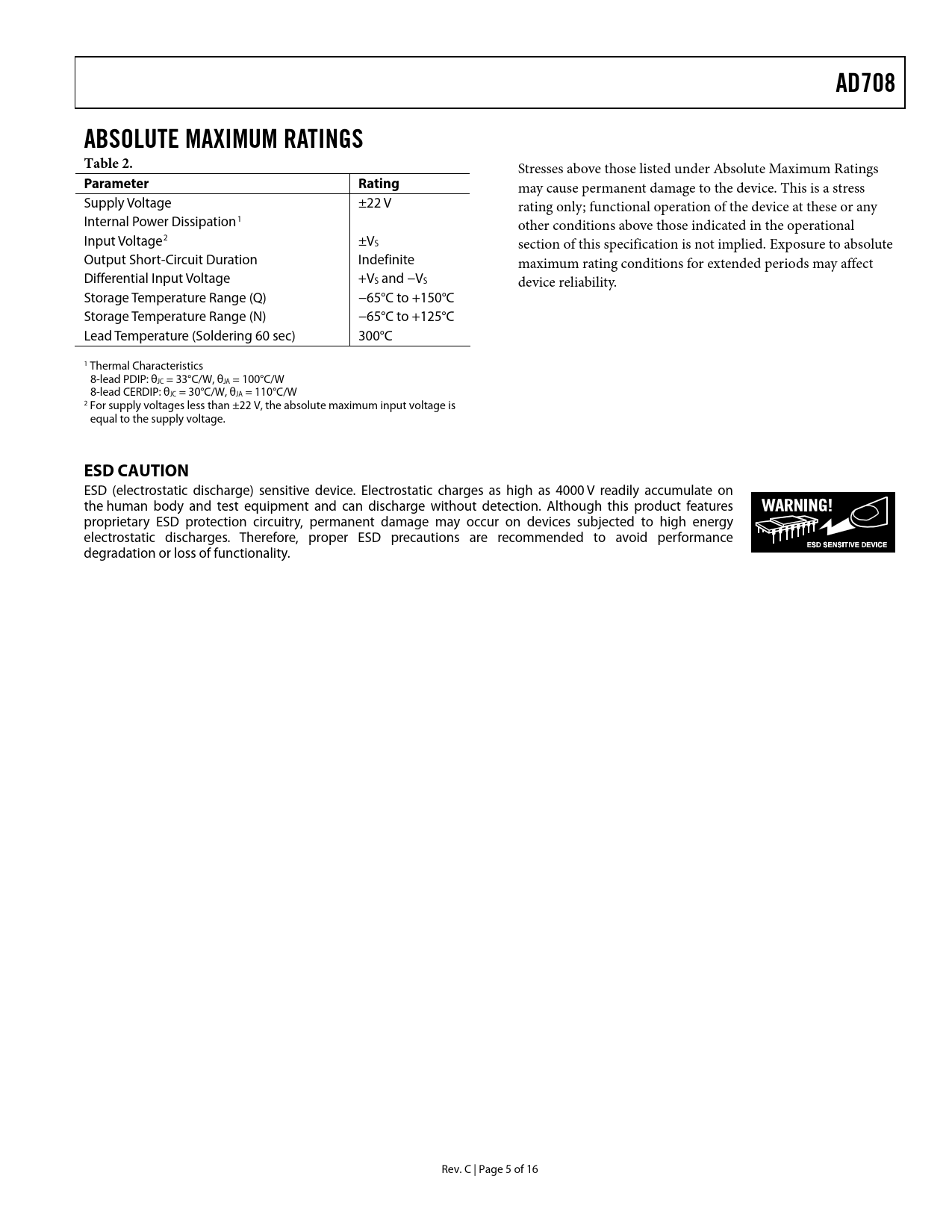AD708 ABSOLUTE MAXIMUM RATINGS Table 2 Parameter Rating ESD CAUTION