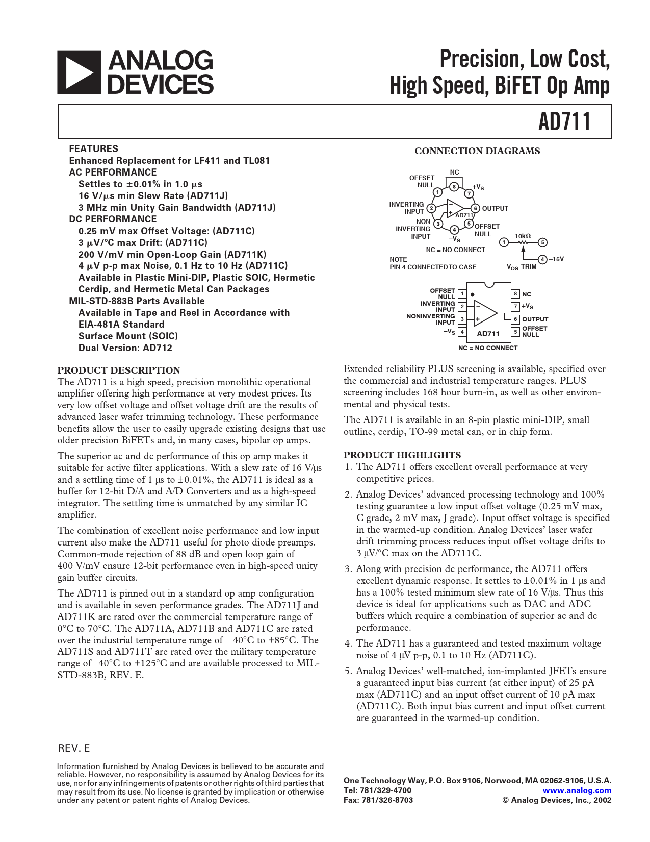 | Pages / Page | 17 / 1 — Precision, Low Cost,. High Speed, BiFET Op Amp. AD711. FEATURES. … |