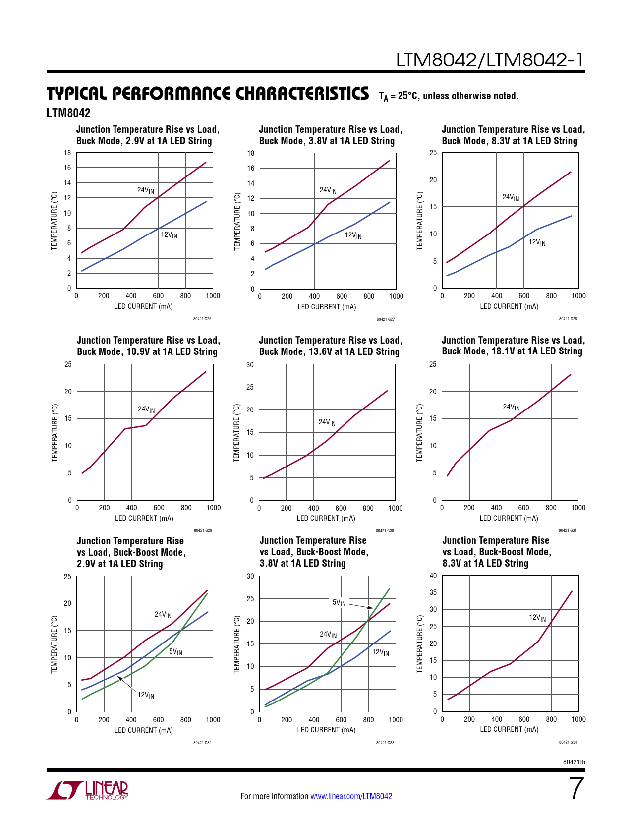 25 30 40 35 25 20 5VIN 30 24VIN 20 12VIN 15 25 24VIN 15 20 5V 12V 10 IN IN 15 10 TEMPERATURE (°C) TEMPERATURE (°C) TEMPERATURE (°C) 10 5 5 12VIN 5 0 0 0 0 200 400 600 800 1000 0 200 400 600 800 1000 0 200 400 600 800 1000 LED CURRENT (mA) LED CURRENT (mA) LED CURRENT (mA) 80421 G32 80421 G33 80421 G34 80421fb For more information www.linear.com/LTM8042 7