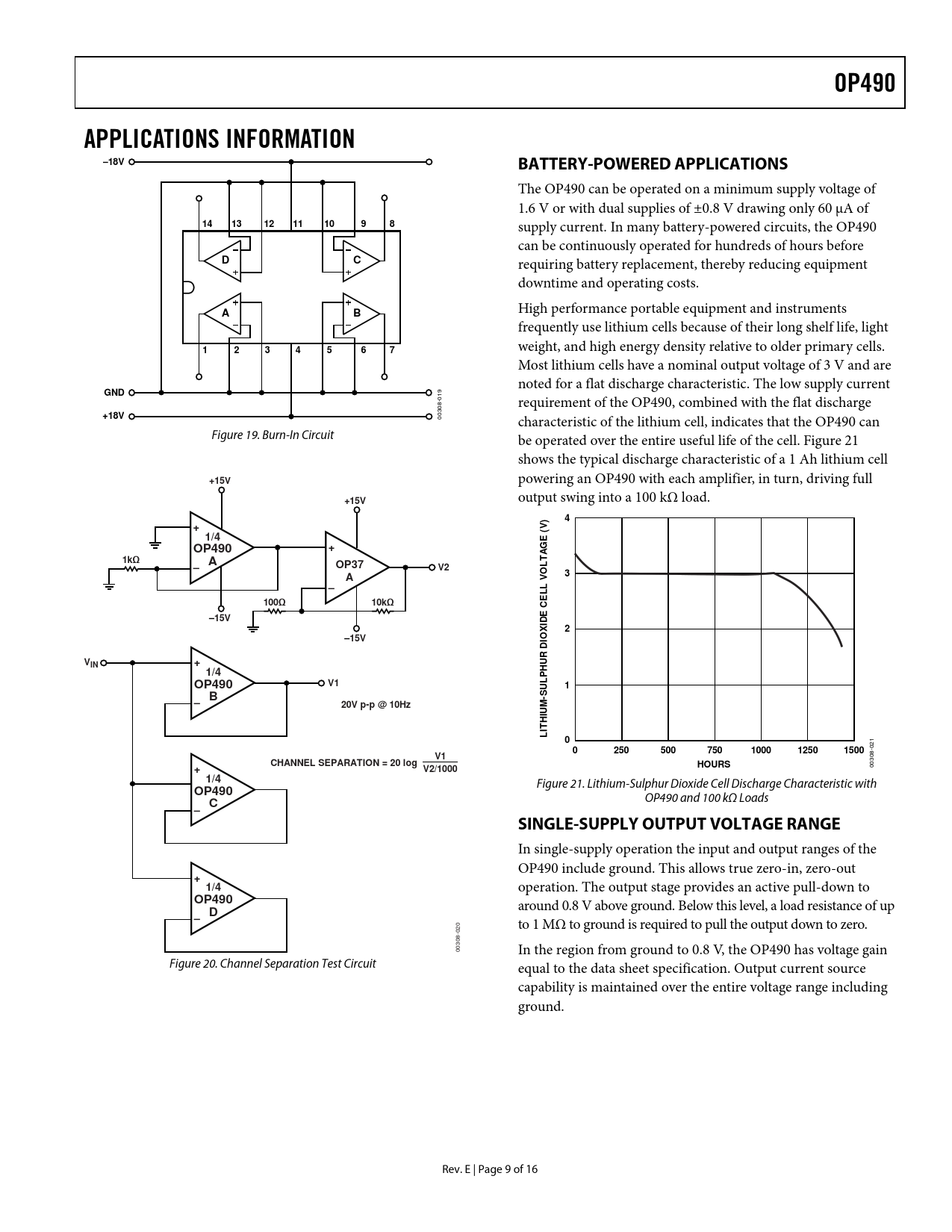 OP490. APPLICATIONS INFORMATION. –18V. BATTERY-POWERED APPLICATIONS. GND. +18V. +15V. V (. 1/4. G A. 1kΩ. OP37. L O. L L. 100Ω. 10kΩ. CE E. –15V. ID X. VIN