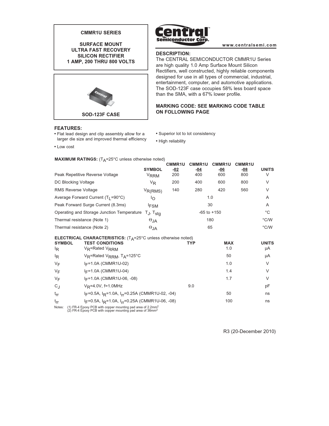 CMMR1U SERIES. SURFACE MOUNT. www.centra lsemi.com. ULTRA FAST RECOVERY. SILICON RECTIFIER. DESCRIPTION:. 1 AMP, 200 THRU 800 VOLTS