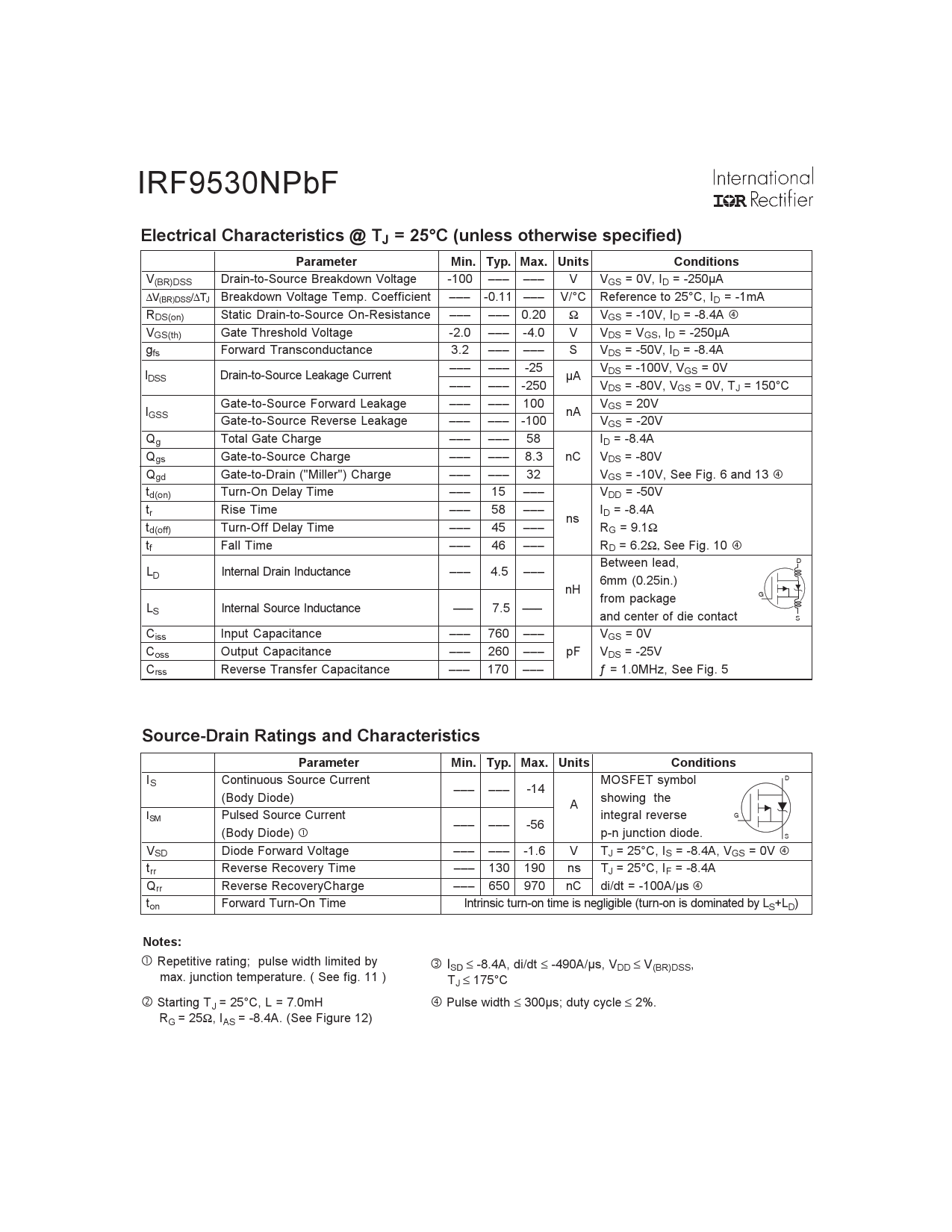 Repetitive rating; pulse width limited by ISD ≤ -8.4A, di/dt ≤ -490A/µs, VDD ≤ V(BR)DSS, max. junction temperature. ( See fig. 11 ) TJ ≤ 175°C Starting TJ = 25°C, L = 7.0mH Pulse width ≤ 300µs; duty cycle ≤ 2%. RG = 25Ω, IAS = -8.4A. (See Figure 12)