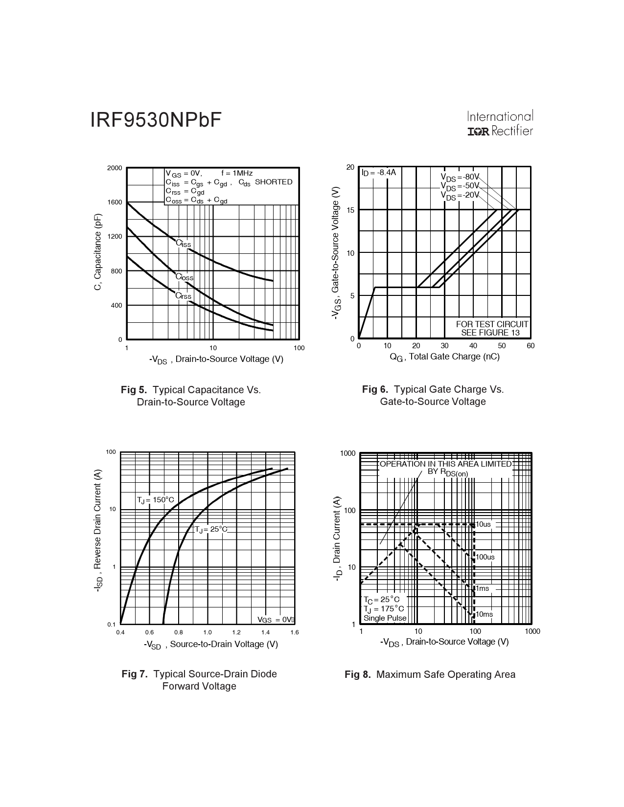 IRF9530NPbF 2000 20 V = 0V, f = 1MHz GS ID = -8.4A V =-80V C = C + C , C SHORTED DS iss gs gd ds V =-50V C DS r ss = C gd V =-20V DS 1600 C os = s C ds + C gd 15 pF) 1200 Ciss citance ( 10 pa 800 , Ca Coss C Crss 5 400 GS-V , Gate-to-Source Voltage (V) FOR TEST CIRCUIT SEE FIGURE 13 0 A 0 1 10 100 0 10 20 30 40 50 60 Q , Total Gate Charge (nC) DS -V , Drain-to-Source Voltage (V) G Fig 5. Typical Capacitance Vs. Fig 6. Typical Gate Charge Vs. Drain-to-Source Voltage Gate-to-Source Voltage 100 1000 OPERATION IN THIS AREA LIMITED ) BY RDS(on) (A rrent T = 150°C J 10 100 n Cu rai 10us T = 25°C J rse D ve 100us 1 Re 10 D-I , Drain Current (A)I , Drain Current (A) , SD -I 1ms T = 25 C ° C T = 175 C ° J 10ms V = GS 0V Single Pulse 0.1 A 1 0.4 0.6 0.8 1.0 1.2 1.4 1.6 1 10 100 1000 -V , Drain-to-Source Voltage (V) SD -V , Source-to-Drain Voltage (V) DS Fig 7. Typical Source-Drain Diode Fig 8. Maximum Safe Operating Area Forward Voltage