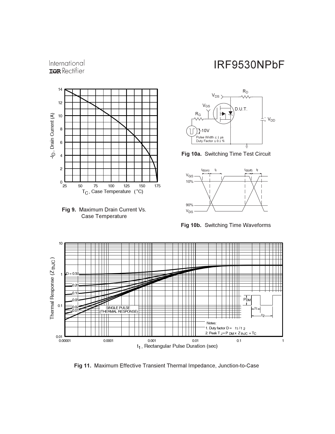 IRF9530NPbF 14 R V D DS 12 VGS D.U.T. R 10 G -+ VDD 8 -10V Pulse Width ≤ 1 µs n Current (A) Duty Factor ≤ 0.1 % 6 D 4 Fig 10a. Switching Time Test Circuit -I , Drai 2 td(on) tr td(off) tf VGS 0 10% 25 50 75 100 125 150 175 T , Case Temperature ( C ° ) C 90% Fig 9. Maximum Drain Current Vs. VDS Case Temperature Fig 10b. Switching Time Waveforms 10 ) thJC (Z 1 D = 0.50 0.20 esponse 0.10 0.05 PDM al R 0.1 m 0.02 SINGLE PULSE t1 0.01 (THERMAL RESPONSE) t2 Ther Notes: 1. Duty factor D = t / t 1 2 2. Peak T J= P DM x Z thJC + TC 0.01 0.00001 0.0001 0.001 0.01 0.1 1 t , Rectangular Pulse Duration (sec) 1 Fig 11. Maximum Effective Transient Thermal Impedance, Junction-to-Case