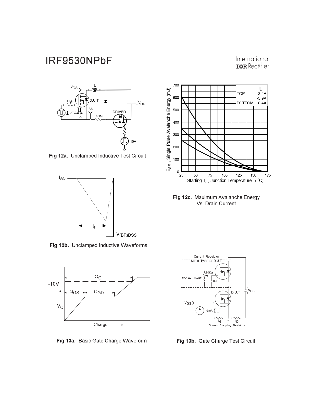 IRF9530NPbF L V 700 DS ID TOP -3.4A 600 -5.9A RG D.U.T VDD BOTTOM -8.4A IAS A DRIVER 500 -20V t 0.01Ω p 400 300 15V 200 Fig 12a. Unclamped Inductive Test Circuit 100 E , Single Pulse Avalanche Energy (mJ) AS 0 I 25 50 75 100 125 150 175 AS Starting T , Junction Temperature ( C ° ) J Fig 12c. Maximum Avalanche Energy Vs. Drain Current tp V(BR)DSS Fig 12b. Unclamped Inductive Waveforms Current Regulator Same Type as D.U.T. 50KΩ QG .2µF 12V -10V .3µF - Q V GS QGD D.U.T. + DS V V GS G -3mA I I G D Charge Current Sampling Resistors Fig 13a. Basic Gate Charge Waveform Fig 13b. Gate Charge Test Circuit