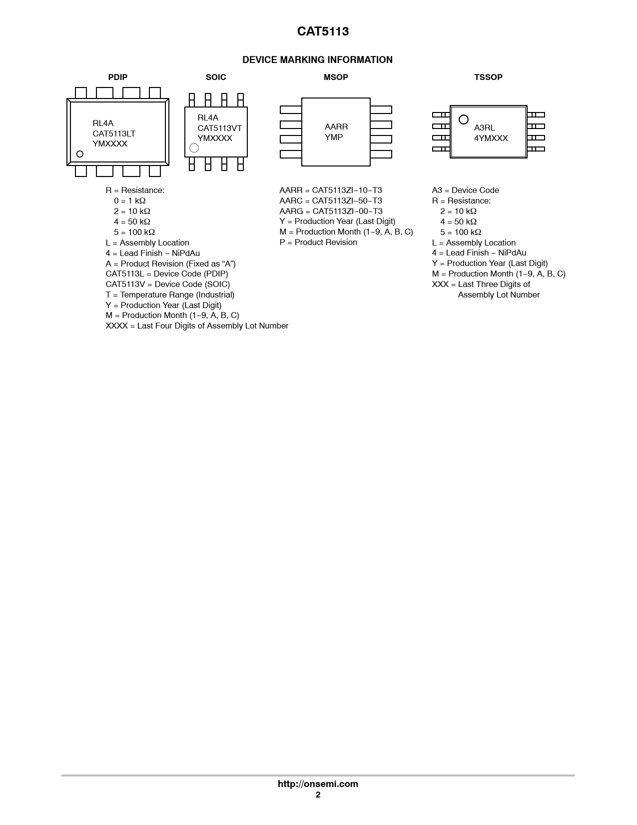 CAT5113 DEVICE MARKING INFORMATION PDIP SOIC MSOP TSSOP http://onsemi.com