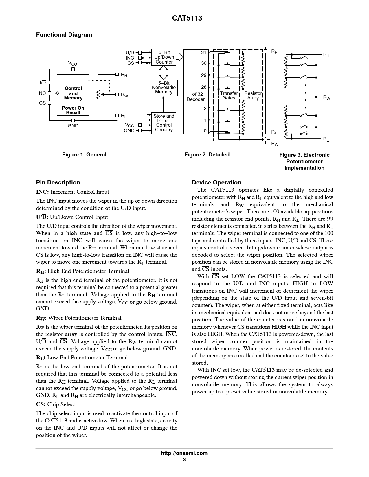 CAT5113Functional Diagram U/D 5−Bit 31 RH R INC Up/Down H V CS Counter CC 30 RH 29 U/D 5−Bit Control Nonvolatile 28 INC and Memory 1 of 32 Transfer Resistor R Memory W Decoder Gates Array RW CS Power On 2 Recall RL Store and Recall 1 GND VCC Control GND Circuitry 0 RL RL RW Figure 1. GeneralFigure 2. DetailedFigure 3. ElectronicPotentiometerImplementationPin DescriptionDevice OperationINC: Increment Control Input The CAT5113 operates like a digitally controlled potentiometer with R The INC input moves the wiper in the up or down direction H and RL equivalent to the high and low terminals and R determined by the condition of the U/D input. W equivalent to the mechanical potentiometer’s wiper. There are 100 available tap positions U/D: Up/Down Control Input including the resistor end points, RH and RL. There are 99 The U/D input controls the direction of the wiper movement. resistor elements connected in series between the RH and RL When in a high state and CS is low, any high−to−low terminals. The wiper terminal is connected to one of the 100 transition on INC will cause the wiper to move one taps and controlled by three inputs, INC, U/D and CS. These increment toward the RH terminal. When in a low state and inputs control a seven−bit up/down counter whose output is CS is low, any high-to-low transition on INC will cause the decoded to select the wiper position. The selected wiper wiper to move one increment towards the RL terminal. position can be stored in nonvolatile memory using the INC R and CS inputs. H: High End Potentiometer Terminal With CS set LOW the CAT5113 is selected and will RH is the high end terminal of the potentiometer. It is not respond to the U/D and INC inputs. HIGH to LOW required that this terminal be connected to a potential greater transitions on INC will increment or decrement the wiper than the RL terminal. Voltage applied to the RH terminal (depending on the state of the U/D input and seven-bit cannot exceed the supply voltage, VCC or go below ground, counter). The wiper, when at either fixed terminal, acts like GND. its mechanical equivalent and does not move beyond the last RW: Wiper Potentiometer Terminal position. The value of the counter is stored in nonvolatile RW is the wiper terminal of the potentiometer. Its position on memory whenever CS transitions HIGH while the INC input the resistor array is controlled by the control inputs, INC, is also HIGH. When the CAT5113 is powered-down, the last U/D and CS. Voltage applied to the RW terminal cannot stored wiper counter position is maintained in the exceed the supply voltage, VCC or go below ground, GND. nonvolatile memory. When power is restored, the contents R of the memory are recalled and the counter is set to the value L: Low End Potentiometer Terminal stored. RL is the low end terminal of the potentiometer. It is not With INC set low, the CAT5113 may be de-selected and required that this terminal be connected to a potential less powered down without storing the current wiper position in than the RH terminal. Voltage applied to the RL terminal nonvolatile memory. This allows the system to always cannot exceed the supply voltage, VCC or go below ground, power up to a preset value stored in nonvolatile memory. GND. RL and RH are electrically interchangeable. CS: Chip Select The chip select input is used to activate the control input of the CAT5113 and is active low. When in a high state, activity on the INC and U/D inputs will not affect or change the position of the wiper. http://onsemi.com3