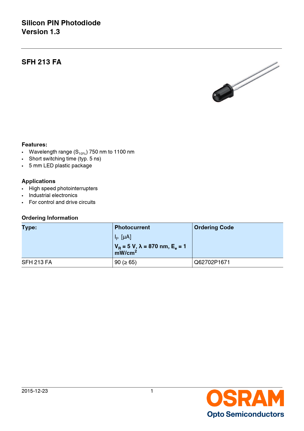 Silicon PIN Photodiode Version 1.3. SFH 213 FA. Features:. Applications. Ordering Information. Type:. Photocurrent. Ordering Code