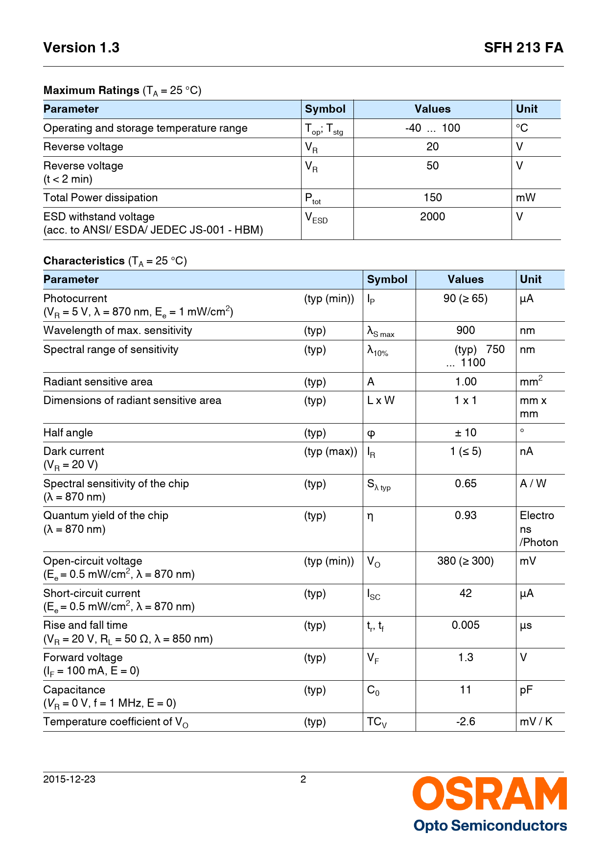 Version 1.3SFH 213 FAMaximum Ratings (TA = 25 °C) ParameterSymbolValuesUnit Operating and storage temperature range T ; T -40 ... 100 °C op stg Reverse voltage V 20 V R Reverse voltage V 50 V R (t < 2 min) Total Power dissipation P 150 mW tot ESD withstand voltage VESD 2000 V (acc. to ANSI/ ESDA/ JEDEC JS-001 - HBM) Characteristics (TA = 25 °C) ParameterSymbolValuesUnit Photocurrent (typ (min)) IP 90 (≥ 65) µA (V = 5 V, λ = 870 nm, E = 1 mW/cm2) R e Wavelength of max. sensitivity (typ) λ 900 nm S max Spectral range of sensitivity (typ) λ (typ) 750 nm 10% ... 1100 Radiant sensitive area (typ) A 1.00 mm2 Dimensions of radiant sensitive area (typ) L x W 1 x 1 mm x mm Half angle (typ) ϕ ± 10 ° Dark current (typ (max)) IR 1 (≤ 5) nA (V = 20 V) R Spectral sensitivity of the chip (typ) S 0.65 A / W λ typ (λ = 870 nm) Quantum yield of the chip (typ) η 0.93 Electro (λ = 870 nm) ns /Photon Open-circuit voltage (typ (min)) VO 380 (≥ 300) mV (E = 0.5 mW/cm2, λ = 870 nm) e Short-circuit current (typ) I 42 µA SC (E = 0.5 mW/cm2, λ = 870 nm) e Rise and fall time (typ) t , t 0.005 µs r f (VR = 20 V, RL = 50 Ω, λ = 850 nm) Forward voltage (typ) VF 1.3 V (IF = 100 mA, E = 0) Capacitance (typ) C0 11 pF (V = 0 V, f = 1 MHz, E = 0) R Temperature coefficient of V (typ) TC -2.6 mV / K O V 2015-12-23 2 Document Outline Features: Applications Ordering Information Maximum Ratings Characteristics Relative Spectral Sensitivity Photocurrent / Open-Circuit Voltage Dark Current Capacitance Dark Current Directional Characteristics Package Outline Disclaimer Glossary
