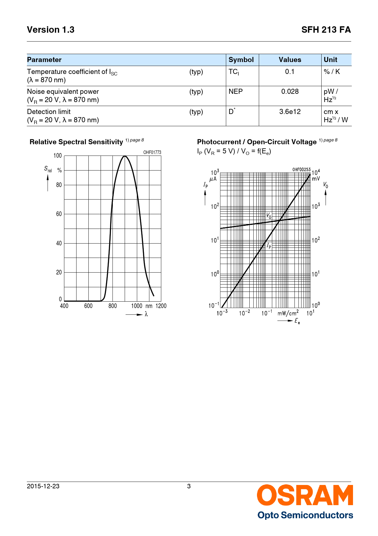 Version 1.3. SFH 213 FA. Parameter. Symbol. Values. Unit. Relative Spectral Sensitivity. Photocurrent / Open-Circuit Voltage