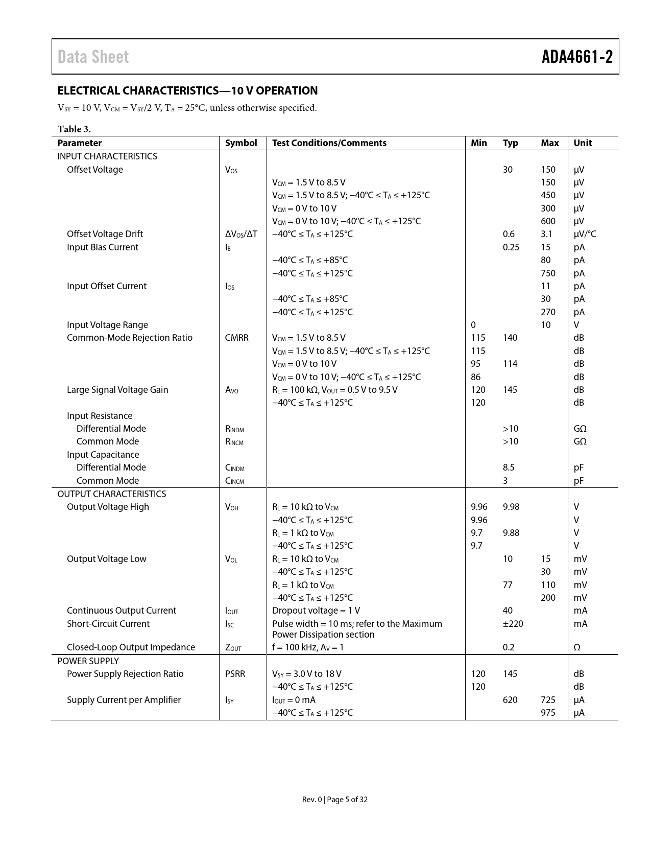 link to page 24 link to page 24 Data SheetADA4661-2ELECTRICAL CHARACTERISTICS—10 V OPERATION VSY = 10 V, VCM = VSY/2 V, TA = 25°C, unless otherwise specified. Table 3. ParameterSymbolTest Conditions/CommentsMinTypMaxUnit INPUT CHARACTERISTICS Offset Voltage VOS 30 150 µV VCM = 1.5 V to 8.5 V 150 µV VCM = 1.5 V to 8.5 V; −40°C ≤ TA ≤ +125°C 450 µV VCM = 0 V to 10 V 300 µV VCM = 0 V to 10 V; −40°C ≤ TA ≤ +125°C 600 µV Offset Voltage Drift ΔVOS/ΔT −40°C ≤ TA ≤ +125°C 0.6 3.1 μV/°C Input Bias Current IB 0.25 15 pA −40°C ≤ TA ≤ +85°C 80 pA −40°C ≤ TA ≤ +125°C 750 pA Input Offset Current IOS 11 pA −40°C ≤ TA ≤ +85°C 30 pA −40°C ≤ TA ≤ +125°C 270 pA Input Voltage Range 0 10 V Common-Mode Rejection Ratio CMRR VCM = 1.5 V to 8.5 V 115 140 dB VCM = 1.5 V to 8.5 V; −40°C ≤ TA ≤ +125°C 115 dB VCM = 0 V to 10 V 95 114 dB VCM = 0 V to 10 V; −40°C ≤ TA ≤ +125°C 86 dB Large Signal Voltage Gain AVO RL = 100 kΩ, VOUT = 0.5 V to 9.5 V 120 145 dB −40°C ≤ TA ≤ +125°C 120 dB Input Resistance Differential Mode RINDM >10 GΩ Common Mode RINCM >10 GΩ Input Capacitance Differential Mode CINDM 8.5 pF Common Mode CINCM 3 pF OUTPUT CHARACTERISTICS Output Voltage High VOH RL = 10 kΩ to VCM 9.96 9.98 V −40°C ≤ TA ≤ +125°C 9.96 V RL = 1 kΩ to VCM 9.7 9.88 V −40°C ≤ TA ≤ +125°C 9.7 V Output Voltage Low VOL RL = 10 kΩ to VCM 10 15 mV −40°C ≤ TA ≤ +125°C 30 mV RL = 1 kΩ to VCM 77 110 mV −40°C ≤ TA ≤ +125°C 200 mV Continuous Output Current IOUT Dropout voltage = 1 V 40 mA Short-Circuit Current ISC Pulse width = 10 ms; refer to the Maximum ±220 mA Power Dissipation section Closed-Loop Output Impedance ZOUT f = 100 kHz, AV = 1 0.2 Ω POWER SUPPLY Power Supply Rejection Ratio PSRR VSY = 3.0 V to 18 V 120 145 dB −40°C ≤ TA ≤ +125°C 120 dB Supply Current per Amplifier ISY IOUT = 0 mA 620 725 µA −40°C ≤ TA ≤ +125°C 975 µA Rev. 0 | Page 5 of 32 Document Outline Features Applications General Description Pin Connection Diagrams Revision History Specifications Electrical Characteristics—18 V Operation Electrical Characteristics—10 V Operation Electrical Characteristics—3.0 V Operation Absolute Maximum Ratings Thermal Resistance ESD Caution Pin Configurations and Function Descriptions Typical Performance Characteristics Applications Information Input Stage Gain Stage Output Stage Maximum Power Dissipation Rail-to-Rail Input and Output Comparator Operation EMI Rejection Ratio Current Shunt Monitor Active Filters Capacitive Load Drive Noise Considerations with High Impedance Sources Outline Dimensions Ordering Guide
