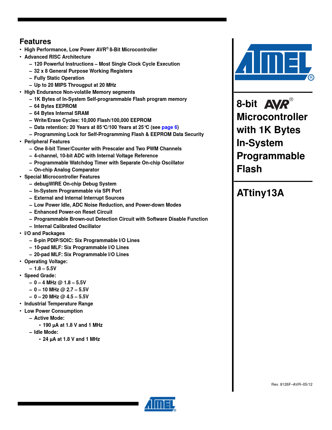 I/O and Packages – 8-pin PDIP/SOIC: Six Programmable I/O Lines – 10-pad MLF: Six Programmable I/O Lines – 20-pad MLF: Six Programmable I/O Lines