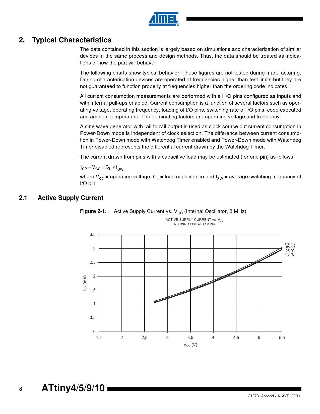The data contained in this section is largely based on simulations and characterization of similar devices in the same process and design methods. Thus, the data should be treated as indica- tions of how the part will behave. The following charts show typical behavior. These figures are not tested during manufacturing. During characterisation devices are operated at frequencies higher than test limits but they are not guaranteed to function properly at frequencies higher than the ordering code indicates. All current consumption measurements are performed with all I/O pins configured as inputs and with internal pull-ups enabled. Current consumption is a function of several factors such as oper- ating voltage, operating frequency, loading of I/O pins, switching rate of I/O pins, code executed and ambient temperature. The dominating factors are operating voltage and frequency. A sine wave generator with rail-to-rail output is used as clock source but current consumption in Power-Down mode is independent of clock selection. The difference between current consump- tion in Power-Down mode with Watchdog Timer enabled and Power-Down mode with Watchdog Timer disabled represents the differential current drawn by the Watchdog Timer. The current drawn from pins with a capacitive load may be estimated (for one pin) as follows: I ≈ V × C × f CP CC L SW where V = operating voltage, C = load capacitance and f = average switching frequency of CC L SW I/O pin.