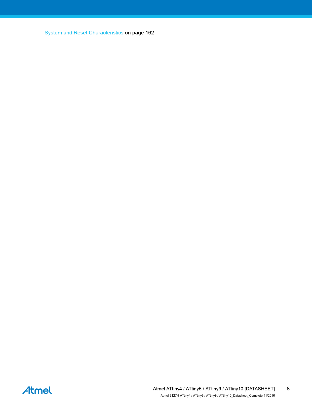 link to page 162 System and Reset Characteristics on page 162 Atmel ATtiny4 / ATtiny5 / ATtiny9 / ATtiny10 [DATASHEET] 8 Atmel-8127H-ATtiny4 / ATtiny5 / ATtiny9 / ATtiny10_Datasheet_Complete-11/2016 Document Outline Introduction Feature Table of Contents 1. Pin Configurations 1.1. Pin Descriptions 1.1.1. VCC 1.1.2. GND 1.1.3. Port B (PB[3:0]) 1.1.4. RESET 2. Ordering Information 2.1. ATtiny4 2.2. ATtiny5 2.3. ATtiny9 2.4. ATtiny10 3. Overview 3.1. Block Diagram 3.1.1. Description 3.2. Comparison of ATtiny4, ATtiny5, ATtiny9 and ATtiny10 4. General Information 4.1. Resources 4.2. Data Retention 4.3. About Code Examples 4.4. Capacitive Touch Sensing 4.4.1. QTouch Library 5. AVR CPU Core 5.1. Overview 5.2. ALU – Arithmetic Logic Unit 5.3. Status Register 5.4. General Purpose Register File 5.5. The X-register, Y-register, and Z-register 5.6. Stack Pointer 5.7. Instruction Execution Timing 5.8. Reset and Interrupt Handling 5.8.1. Interrupt Response Time 5.9. Register Description 5.9.1. Configuration Change Protection Register 5.9.2. Stack Pointer Register High byte 5.9.3. Stack Pointer Register Low byte 5.9.4. Status Register 6. AVR Memories 6.1. Overview 6.2. In-System Reprogrammable Flash Program Memory 6.3. SRAM Data Memory 6.3.1. Data Memory Access Times 6.4. I/O Memory 7. Clock System 7.1. Clock Distribution 7.2. Clock Subsystems 7.2.1. CPU Clock – clkCPU 7.2.2. I/O Clock – clkI/O 7.2.3. NVM Clock – clkNVM 7.2.4. ADC Clock – clkADC 7.3. Clock Sources 7.3.1. Calibrated Internal 8 MHz Oscillator 7.3.2. External Clock 7.3.3. Internal 128 kHz Oscillator 7.3.4. Switching Clock Source 7.3.5. Default Clock Source 7.4. System Clock Prescaler 7.4.1. Switching Prescaler Setting 7.5. Starting 7.5.1. Starting from Reset 7.5.2. Starting from Power-Down Mode 7.5.3. Starting from Idle / ADC Noise Reduction / Standby Mode 7.6. Register Description 7.6.1. Clock Main Settings Register 7.6.2. Oscillator Calibration Register 7.6.3. Clock Prescaler Register 8. Power Management and Sleep Modes 8.1. Overview 8.2. Sleep Modes 8.2.1. Idle Mode 8.2.2. ADC Noise Reduction Mode 8.2.3. Power-Down Mode 8.2.4. Standby Mode 8.3. Power Reduction Register 8.4. Minimizing Power Consumption 8.4.1. Analog Comparator 8.4.2. Analog to Digital Converter 8.4.3. Watchdog Timer 8.4.4. Port Pins 8.5. Register Description 8.5.1. Sleep Mode Control Register 8.5.2. Power Reduction Register 9. System Control and Reset 9.1. Resetting the AVR 9.2. Reset Sources 9.2.1. Power-on Reset 9.2.2. VCC Level Monitoring 9.2.3. External Reset 9.2.4. Watchdog System Reset 9.3. Watchdog Timer 9.3.1. Overview 9.3.2. Procedure for Changing the Watchdog Timer Configuration 9.3.2.1. Safety Level 1 9.3.2.2. Safety Level 2 9.3.3. Code Examples 9.4. Register Description 9.4.1. Watchdog Timer Control Register 9.4.2. VCC Level Monitoring Control and Status register 9.4.3. Reset Flag Register 10. Interrupts 10.1. Overview 10.2. Interrupt Vectors 10.3. External Interrupts 10.3.1. Low Level Interrupt 10.3.2. Pin Change Interrupt Timing 10.4. Register Description 10.4.1. External Interrupt Control Register A 10.4.2. External Interrupt Mask Register 10.4.3. External Interrupt Flag Register 10.4.4. Pin Change Interrupt Control Register 10.4.5. Pin Change Interrupt Flag Register 10.4.6. Pin Change Mask Register 11. I/O-Ports 11.1. Overview 11.2. Ports as General Digital I/O 11.2.1. Configuring the Pin 11.2.2. Toggling the Pin 11.2.3. Break-Before-Make Switching 11.2.4. Reading the Pin Value 11.2.5. Digital Input Enable and Sleep Modes 11.2.6. Unconnected Pins 11.2.7. Program Example 11.2.8. Alternate Port Functions 11.2.8.1. Alternate Functions of Port B 11.3. Register Description 11.3.1. Port Control Register 11.3.2. Port B Pull-up Enable Control Register 11.3.3. Port B Data Register 11.3.4. Port B Data Direction Register 11.3.5. Port B Input Pins Address 12. 16-bit Timer/Counter0 with PWM 12.1. Features 12.2. Overview 12.2.1. Definitions 12.2.2. Registers 12.3. Accessing 16-bit Registers 12.3.1. Reusing the Temporary High Byte Register 12.4. Timer/Counter Clock Sources 12.4.1. Internal Clock Source - Prescaler 12.4.2. Prescaler Reset 12.4.3. External Clock Source 12.5. Counter Unit 12.6. Input Capture Unit 12.6.1. Input Capture Trigger Source 12.6.2. Noise Canceler 12.6.3. Using the Input Capture Unit 12.7. Output Compare Units 12.7.1. Force Output Compare 12.7.2. Compare Match Blocking by TCNT0 Write 12.7.3. Using the Output Compare Unit 12.8. Compare Match Output Unit 12.8.1. Compare Output Mode and Waveform Generation 12.9. Modes of Operation 12.9.1. Normal Mode 12.9.2. Clear Timer on Compare Match (CTC) Mode 12.9.3. Fast PWM Mode 12.9.4. Phase Correct PWM Mode 12.9.5. Phase and Frequency Correct PWM Mode 12.10. Timer/Counter Timing Diagrams 12.11. Register Description 12.11.1. Timer/Counter0 Control Register A 12.11.2. Timer/Counter0 Control Register B 12.11.3. Timer/Counter0 Control Register C 12.11.4. Timer/Counter0 High byte 12.11.5. Timer/Counter0 Low byte 12.11.6. Output Compare Register 0 A High byte 12.11.7. Output Compare Register 0 A Low byte 12.11.8. Output Compare Register 0 B High byte 12.11.9. Output Compare Register 0 B Low byte 12.11.10. Input Capture Register 0 High byte 12.11.11. Input Capture Register 0 Low byte 12.11.12. Timer/Counter0 Interrupt Mask Register 12.11.13. Timer/Counter0 Interrupt Flag Register 12.11.14. General Timer/Counter Control Register 13. Analog Comparator 13.1. Overview 13.2. Register Description 13.2.1. Analog Comparator Control and Status Register 13.2.2. Digital Input Disable Register 0 14. ADC - Analog to Digital Converter 14.1. Features 14.2. Overview 14.3. Starting a Conversion 14.4. Prescaling and Conversion Timing 14.5. Changing Channel or Reference Selection 14.6. ADC Input Channels 14.7. ADC Voltage Reference 14.8. ADC Noise Canceler 14.9. Analog Input Circuitry 14.10. Analog Noise Canceling Techniques 14.11. ADC Accuracy Definitions 14.12. ADC Conversion Result 14.13. Register Description 14.13.1. 