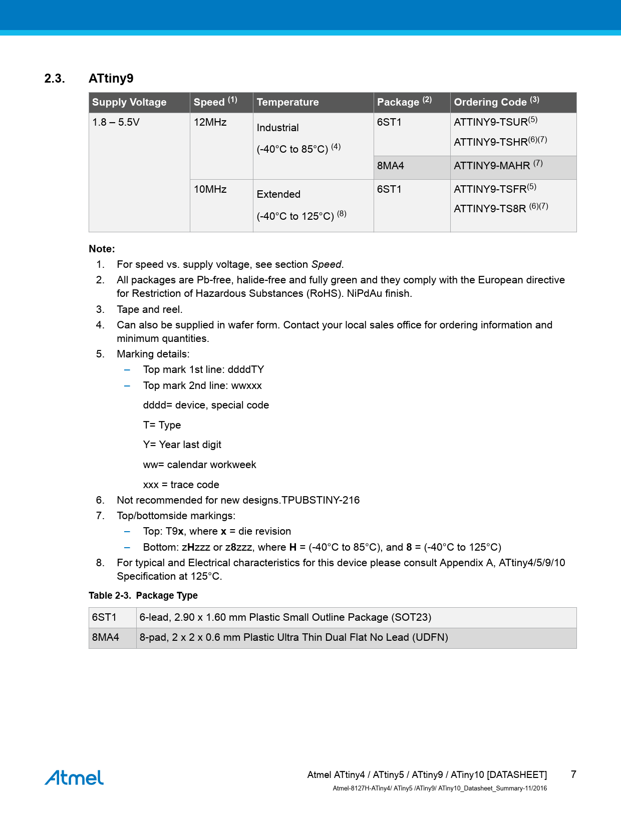 2.3. ATtiny9. Supply Voltage. Speed (1). Temperature. Package (2). Ordering Code (3). Note: . Table 2-3. Package Type
