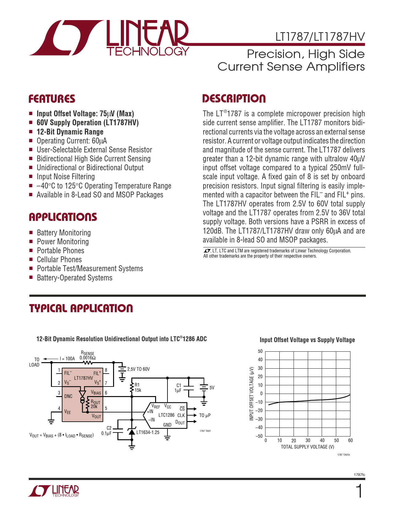 LT1787/LT1787HV Precision, High Side Current Sense Amplifiers UFEATURESDESCRIPTIO ■ Input Offset Voltage: 75 µ V (Max) The LT®1787 is a complete micropower precision high ■ 60V Supply Operation (LT1787HV) side current sense amplifier. The LT1787 monitors bidi- ■ 12-Bit Dynamic Range rectional currents via the voltage across an external sense ■ Operating Current: 60µA resistor. A current or voltage output indicates the direction ■ User-Selectable External Sense Resistor and magnitude of the sense current. The LT1787 delivers ■ Bidirectional High Side Current Sensing greater than a 12-bit dynamic range with ultralow 40µV ■ Unidirectional or Bidirectional Output input offset voltage compared to a typical 250mV full- ■ Input Noise Filtering scale input voltage. A fixed gain of 8 is set by onboard ■ –40°C to 125°C Operating Temperature Range precision resistors. Input signal filtering is easily imple- ■ Available in 8-Lead SO and MSOP Packages mented with a capacitor between the FIL– and FIL+ pins. The LT1787HV operates from 2.5V to 60V total supply U voltage and the LT1787 operates from 2.5V to 36V total APPLICATIO S supply voltage. Both versions have a PSRR in excess of ■ 120dB. The LT1787/LT1787HV draw only 60 Battery Monitoring µA and are ■ available in 8-lead SO and MSOP packages. Power Monitoring ■ Portable Phones , LT, LTC and LTM are registered trademarks of Linear Technology Corporation. All other trademarks are the property of their respective owners. ■ Cellular Phones ■ Portable Test/Measurement Systems ■ Battery-Operated Systems UTYPICAL APPLICATIO12-Bit Dynamic Resolution Unidirectional Output into LTC®1286 ADCInput Offset Voltage vs Supply Voltage 50 RSENSE 0.0016 I = 100A Ω TO 40 LOAD 30 1 8 2.5V TO 60V µV) FIL+ FIL– 20 LT1787HV – + 2 VS VS 7 R1 C1 10 5V 15k 1µF 3 VBIAS 6 0 DNC ROUT –10 V 4 20k 5 REF VCC CS –20 V +IN EE V LTC1286 CLK TO µP OUT –IN INPUT OFFSET VOLTAGE ( –30 D GND OUT C2 –40 1787 TA01 0.1µF LT1634-1.25 VOUT = VBIAS + (8 • ILOAD • RSENSE) –50 0 10 20 30 40 50 60 TOTAL SUPPLY VOLTAGE (V) 1787 TA01b 1787fc 1