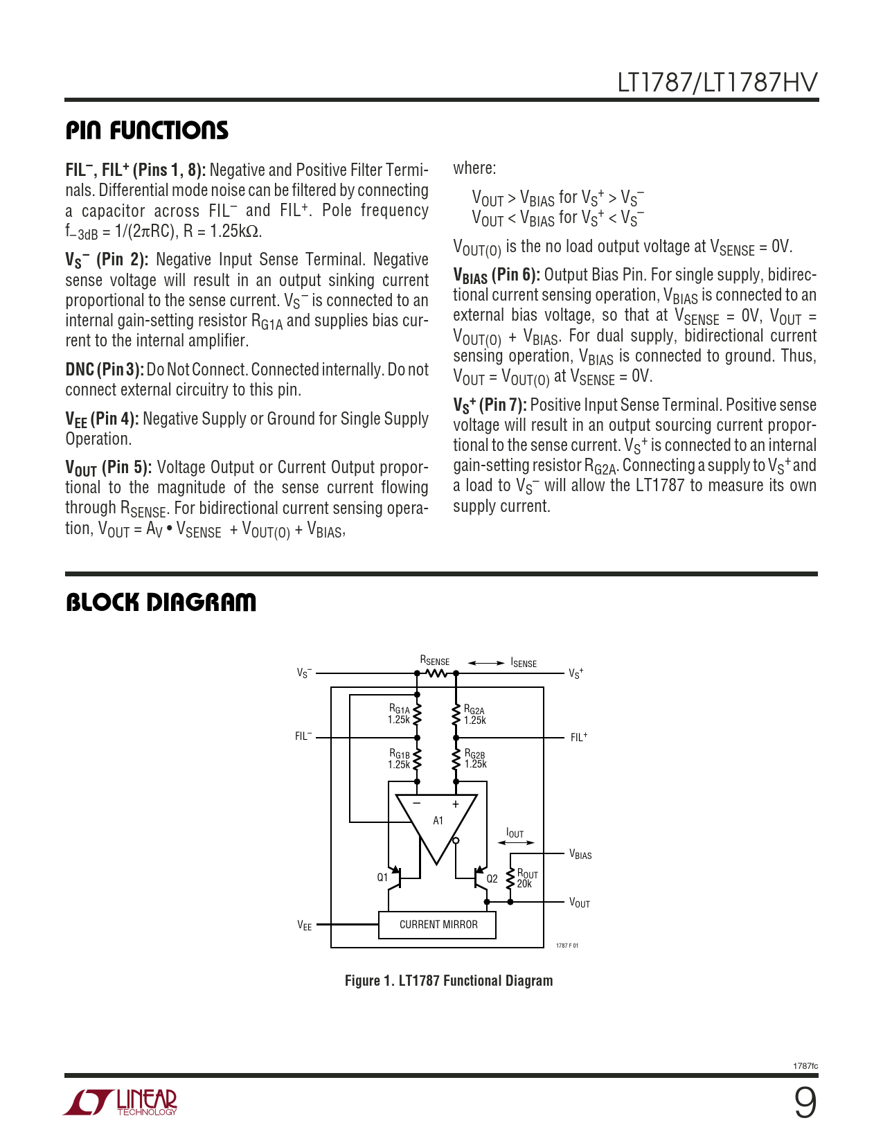 LT1787/LT1787HV UUUPIN FUNCTIONSFIL–, FIL+ (Pins 1, 8): Negative and Positive Filter Termi- where: nals. Differential mode noise can be filtered by connecting V + – OUT > VBIAS for VS > VS a capacitor across FIL– and FIL+. Pole frequency V + – OUT < VBIAS for VS < VS f–3dB = 1/(2πRC), R = 1.25kΩ. VOUT(O) is the no load output voltage at VSENSE = 0V. V –S (Pin 2): Negative Input Sense Terminal. Negative sense voltage will result in an output sinking current VBIAS (Pin 6): Output Bias Pin. For single supply, bidirec- proportional to the sense current. V – tional current sensing operation, V S is connected to an BIAS is connected to an internal gain-setting resistor R external bias voltage, so that at V G1A and supplies bias cur- SENSE = 0V, VOUT = rent to the internal amplifier. VOUT(O) + VBIAS. For dual supply, bidirectional current sensing operation, VBIAS is connected to ground. Thus, DNC (Pin 3): Do Not Connect. Connected internally. Do not VOUT = VOUT(O) at VSENSE = 0V. connect external circuitry to this pin. V +S (Pin 7): Positive Input Sense Terminal. Positive sense VEE (Pin 4): Negative Supply or Ground for Single Supply voltage will result in an output sourcing current propor- Operation. tional to the sense current. V + S is connected to an internal V gain-setting resistor R + and OUT (Pin 5): Voltage Output or Current Output propor- G2A. Connecting a supply to VS tional to the magnitude of the sense current flowing a load to V – S will allow the LT1787 to measure its own through R supply current. SENSE. For bidirectional current sensing opera- tion, VOUT = AV • VSENSE + VOUT(O) + VBIAS, WBLOCK DIAGRAM RSENSE ISENSE V – + S VS RG1A RG2A 1.25k 1.25k FIL– FIL+ R R G1B G2B 1.25k 1.25k – + A1 IOUT VBIAS ROUT Q1 Q2 20k VOUT VEE CURRENT MIRROR 1787 F 01 Figure 1. LT1787 Functional Diagram 1787fc 9