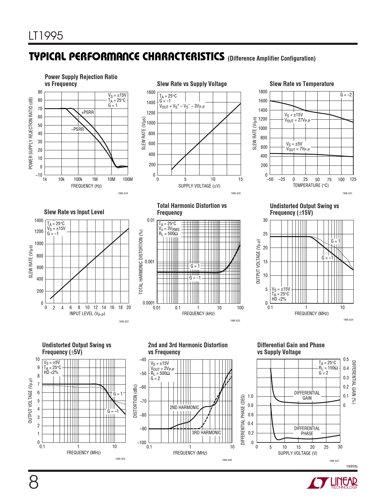 1400 0.01 30 T T A = 25°C A = 25°C V V S = ±15V o = 3VRMS 1200 G = –1 RL = 500Ω 25 ) G = 1 1000 P-P 20 µs) 800 G = –1 0.001 15 G = 1 600 10 SLEW RATE (V/ G = –1 400 OUTPUT VOLTAGE (V 5 VS = ±15V 200 TOTAL HARMONIC DISTORTION (%) TA = 25°C HD <2% 0 0.0001 0 0 2 4 6 8 10 12 14 16 18 20 0.01 0.1 1 10 100 0.1 1 10 INPUT LEVEL (V FREQUENCY (kHz) FREQUENCY (MHz) P-P) 1995 G24 1995 G23 1995 G22
