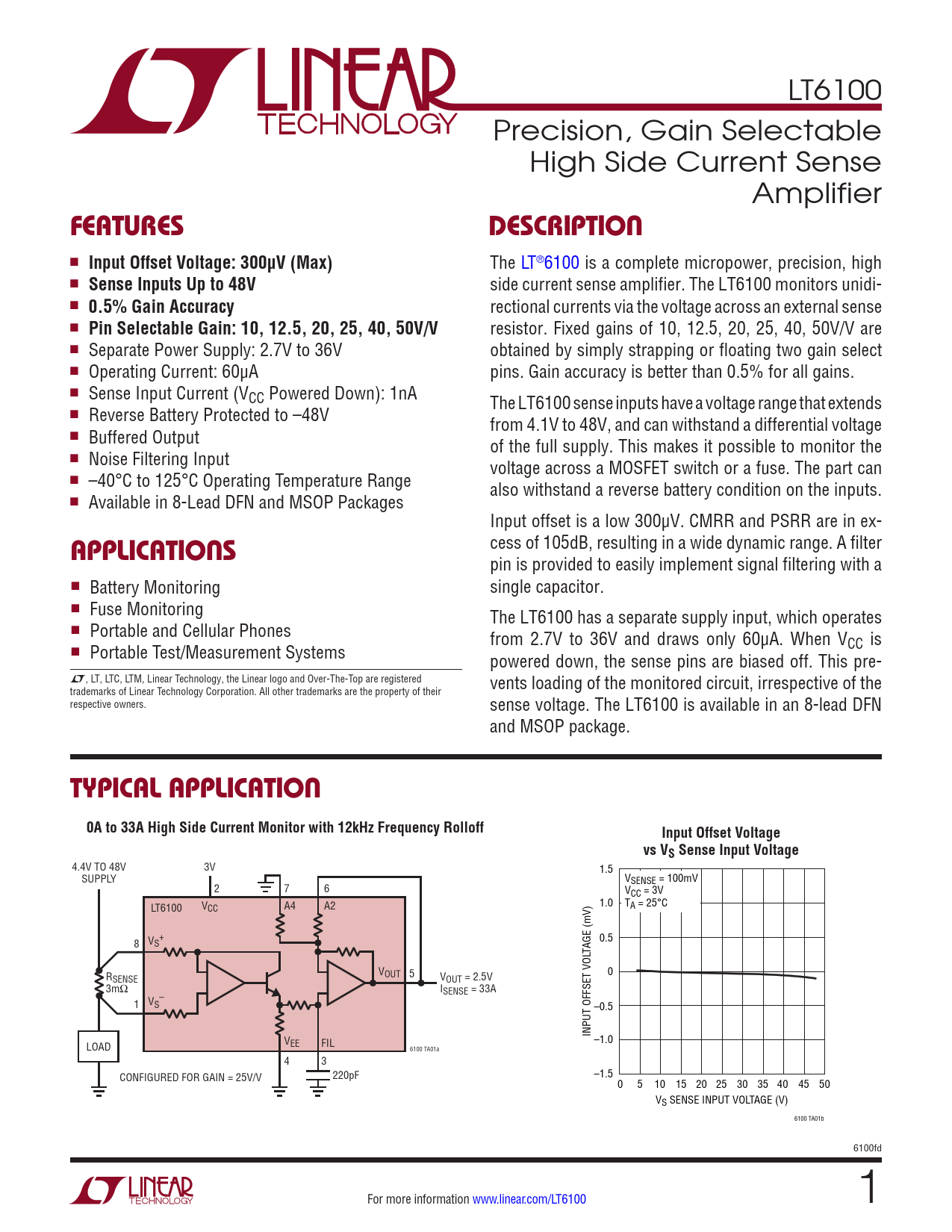 resistor. Fixed gains of 10, 12.5, 20, 25, 40, 50V/V are n Separate Power Supply: 2.7V to 36V obtained by simply strapping or floating two gain select n Operating Current: 60µA pins. Gain accuracy is better than 0.5% for all gains. n Sense Input Current (VCC Powered Down): 1nA The LT6100 sense inputs have a voltage range that extends n Reverse Battery Protected to –48V from 4.1V to 48V, and can withstand a differential voltage n Buffered Output of the full supply. This makes it possible to monitor the n Noise Filtering Input voltage across a MOSFET switch or a fuse. The part can n –40°C to 125°C Operating Temperature Range also withstand a reverse battery condition on the inputs. n Available in 8-Lead DFN and MSOP Packages Input offset is a low 300µV. CMRR and PSRR are in ex- cess of 105dB, resulting in a wide dynamic range. A filter