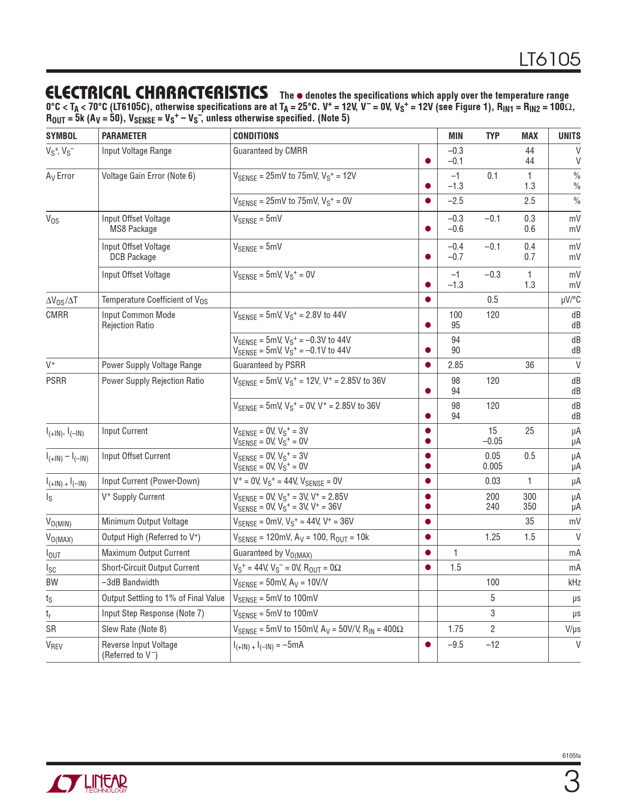 V + – S , VS Input Voltage Range Guaranteed by CMRR –0.3 44 V l –0.1 44 V A + V Error Voltage Gain Error (Note 6) VSENSE = 25mV to 75mV, VS = 12V –1 0.1 1 % l –1.3 1.3 % V + SENSE = 25mV to 75mV, VS = 0V l –2.5 2.5 % VOS Input Offset Voltage VSENSE = 5mV –0.3 –0.1 0.3 mV MS8 Package l –0.6 0.6 mV Input Offset Voltage VSENSE = 5mV –0.4 –0.1 0.4 mV DCB Package l –0.7 0.7 mV Input Offset Voltage V + SENSE = 5mV, VS = 0V –1 –0.3 1 mV l –1.3 1.3 mV ΔVOS/ΔT Temperature Coeffi cient of VOS l 0.5 μV/°C CMRR Input Common Mode V + SENSE = 5mV, VS = 2.8V to 44V 100 120 dB Rejection Ratio l 95 dB V + SENSE = 5mV, VS = –0.3V to 44V 94 dB V + SENSE = 5mV, VS = –0.1V to 44V l 90 dB V+ Power Supply Voltage Range Guaranteed by PSRR l 2.85 36 V PSRR Power Supply Rejection Ratio V + SENSE = 5mV, VS = 12V, V+ = 2.85V to 36V 98 120 dB l 94 dB V + SENSE = 5mV, VS = 0V, V+ = 2.85V to 36V 98 120 dB l 94 dB I + (+IN), I(–IN) Input Current VSENSE = 0V, VS = 3V l 15 25 μA V + SENSE = 0V, VS = 0V l –0.05 μA I + (+IN) – I(–IN) Input Offset Current VSENSE = 0V, VS = 3V l 0.05 0.5 μA V + SENSE = 0V, VS = 0V l 0.005 μA I + (+IN) + I(–IN) Input Current (Power-Down) V+ = 0V, VS = 44V, VSENSE = 0V l 0.03 1 μA I + S V+ Supply Current VSENSE = 0V, VS = 3V, V+ = 2.85V l 200 300 μA V + SENSE = 0V, VS = 3V, V+ = 36V l 240 350 μA V + O(MIN) Minimum Output Voltage VSENSE = 0mV, VS = 44V, V+ = 36V l 35 mV VO(MAX) Output High (Referred to V+) VSENSE = 120mV, AV = 100, ROUT = 10k l 1.25 1.5 V IOUT Maximum Output Current Guaranteed by VO(MAX) l 1 mA I + – SC Short-Circuit Output Current VS = 44V, VS = 0V, ROUT = 0Ω l 1.5 mA BW –3dB Bandwidth VSENSE = 50mV, AV = 10V/V 100 kHz tS Output Settling to 1% of Final Value VSENSE = 5mV to 100mV 5 μs tr Input Step Response (Note 7) VSENSE = 5mV to 100mV 3 μs SR Slew Rate (Note 8) VSENSE = 5mV to 150mV, AV = 50V/V, RIN = 400Ω 1.75 2 V/μs VREV Reverse Input Voltage I(+IN) + I(–IN) = –5mA l –9.5 –12 V (Referred to V –) 6105fa 3