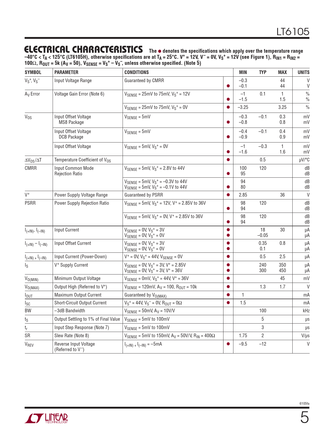 V + – S , VS Input Voltage Range Guaranteed by CMRR –0.3 44 V l –0.1 44 V A + V Error Voltage Gain Error (Note 6) VSENSE = 25mV to 75mV, VS = 12V –1 0.1 1 % l –1.5 1.5 % V + SENSE = 25mV to 75mV, VS = 0V l –3.25 3.25 % VOS Input Offset Voltage VSENSE = 5mV –0.3 –0.1 0.3 mV MS8 Package l –0.8 0.8 mV Input Offset Voltage VSENSE = 5mV –0.4 –0.1 0.4 mV DCB Package l –0.9 0.9 mV Input Offset Voltage V + SENSE = 5mV, VS = 0V –1 –0.3 1 mV l –1.6 1.6 mV ΔVOS/ΔT Temperature Coeffi cient of VOS l 0.5 μV/°C CMRR Input Common Mode V + SENSE = 5mV, VS = 2.8V to 44V 100 120 dB Rejection Ratio l 95 dB V + SENSE = 5mV, VS = –0.3V to 44V 94 dB V + SENSE = 5mV, VS = –0.1V to 44V l 80 dB V+ Power Supply Voltage Range Guaranteed by PSRR l 2.85 36 V PSRR Power Supply Rejection Ratio V + SENSE = 5mV, VS = 12V, V+ = 2.85V to 36V 98 120 dB l 94 dB V + SENSE = 5mV, VS = 0V, V+ = 2.85V to 36V 98 120 dB l 94 dB I + (+IN), I(–IN) Input Current VSENSE = 0V, VS = 3V l 18 30 μA V + SENSE = 0V, VS = 0V l –0.05 μA I + (+IN) – I(–IN) Input Offset Current VSENSE = 0V, VS = 3V l 0.35 0.8 μA V + SENSE = 0V, VS = 0V l 0.1 μA I + (+IN) + I(–IN) Input Current (Power-Down) V+ = 0V, VS = 44V, VSENSE = 0V l 0.5 2.5 μA I + S V+ Supply Current VSENSE = 0V, VS = 3V, V+ = 2.85V l 240 350 μA V + SENSE = 0V, VS = 3V, V+ = 36V l 300 450 μA V + O(MIN) Minimum Output Voltage VSENSE = 0mV, VS = 44V, V+ = 36V l 45 mV VO(MAX) Output High (Referred to V+) VSENSE = 120mV, AV = 100, ROUT = 10k l 1.3 1.7 V IOUT Maximum Output Current Guaranteed by VO(MAX) l 1 mA I + – SC Short-Circuit Output Current VS = 44V, VS = 0V, ROUT = 0Ω l 1.5 mA BW –3dB Bandwidth VSENSE = 50mV, AV = 10V/V 100 kHz tS Output Settling to 1% of Final Value VSENSE = 5mV to 100mV 5 μs tr Input Step Response (Note 7) VSENSE = 5mV to 100mV 3 μs SR Slew Rate (Note 8) VSENSE = 5mV to 150mV, AV = 50V/V, RIN = 400Ω 1.75 2 V/μs VREV Reverse Input Voltage I(+IN) + I(–IN) = –5mA l –9.5 –12 V (Referred to V –) 6105fa 5