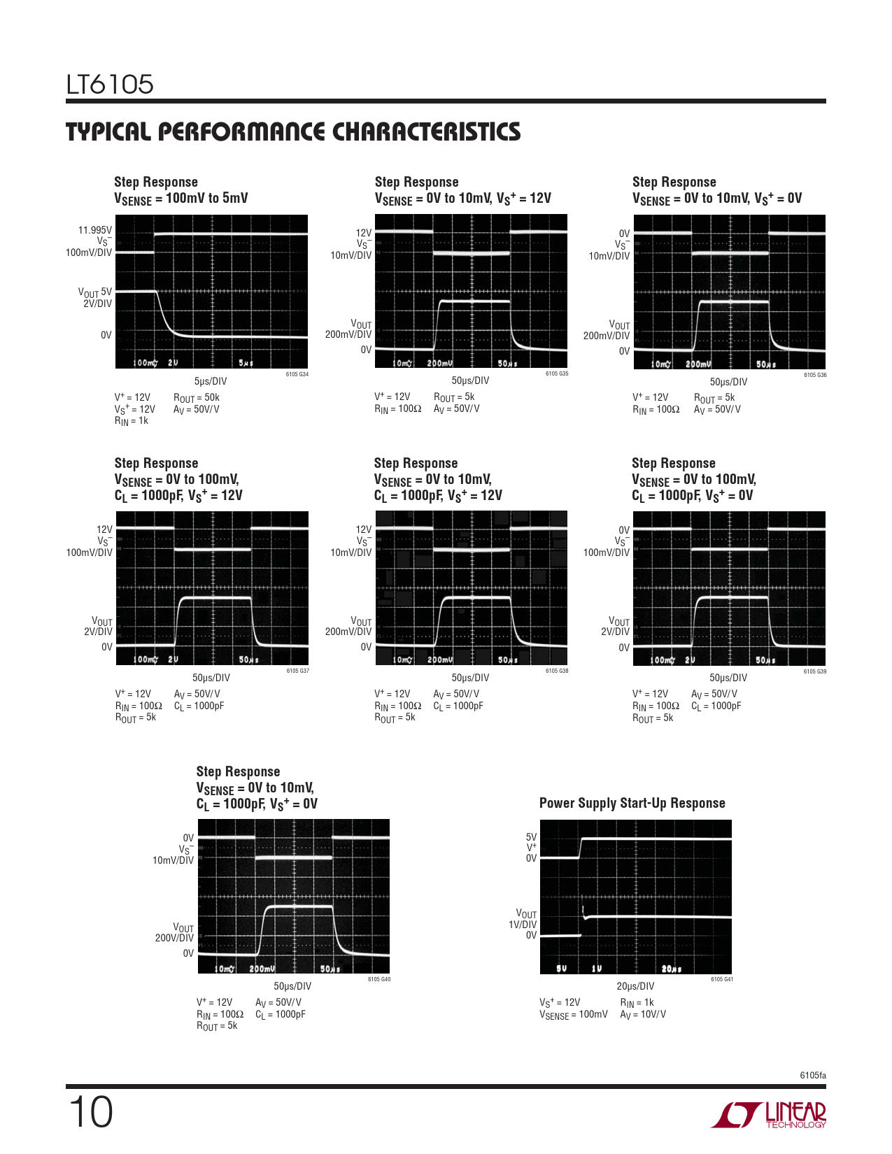 0V 5V V – V+ S 0V 10mV/DIV VOUT 1V/DIV VOUT 0V 200V/DIV 0V 6105 G40 6105 G41 50μs/DIV 20μs/DIV V+ = 12V AV = 50V/ V V + S = 12V RIN = 1k RIN = 100Ω CL = 1000pF VSENSE = 100mV AV = 10V/ V ROUT = 5k 6105fa 10