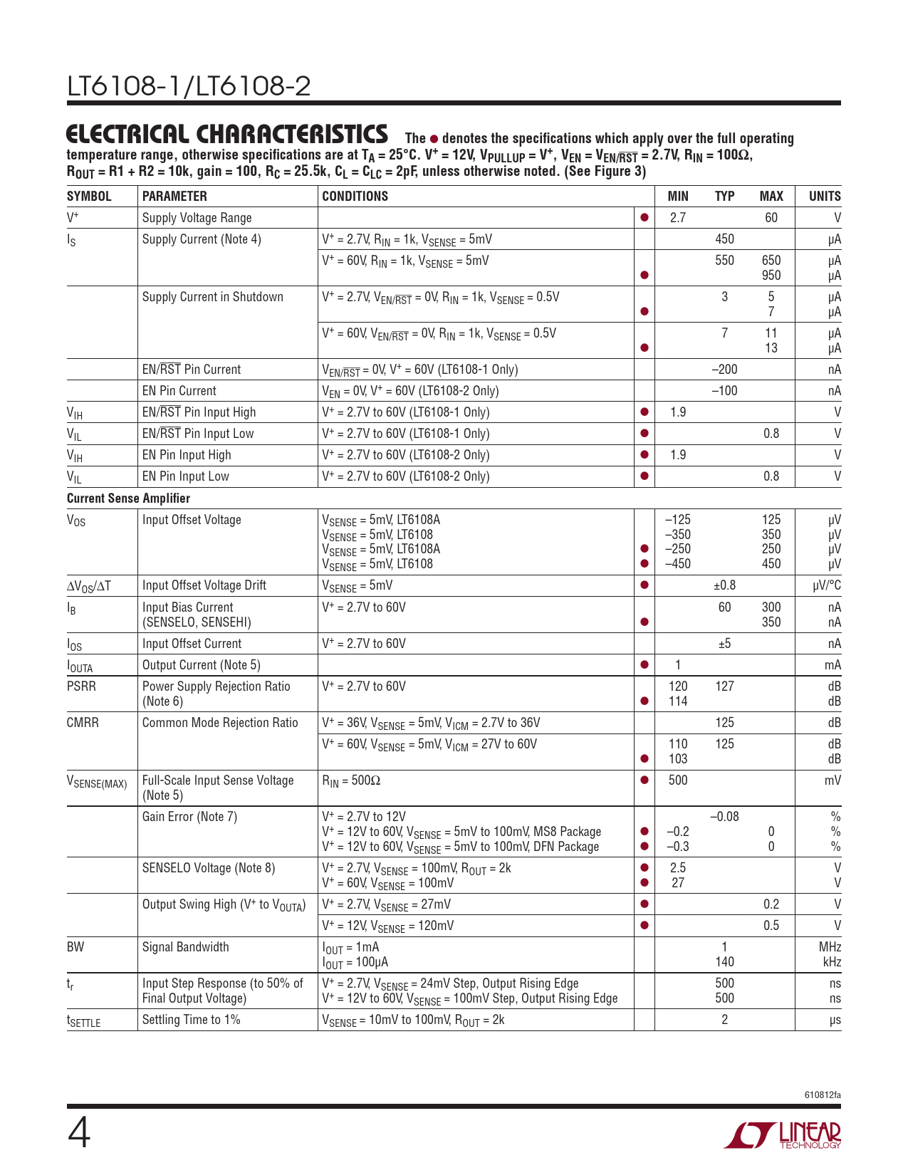 V+ Supply Voltage Range l 2.7 60 V IS Supply Current (Note 4) V+ = 2.7V, RIN = 1k, VSENSE = 5mV 450 µA V+ = 60V, RIN = 1k, VSENSE = 5mV 550 650 µA l 950 µA Supply Current in Shutdown V+ = 2.7V, VEN/RST = 0V, RIN = 1k, VSENSE = 0.5V 3 5 µA l 7 µA V+ = 60V, VEN/RST = 0V, RIN = 1k, VSENSE = 0.5V 7 11 µA l 13 µA EN/RST Pin Current VEN/RST = 0V, V+ = 60V (LT6108-1 Only) –200 nA EN Pin Current VEN = 0V, V+ = 60V (LT6108-2 Only) –100 nA VIH EN/RST Pin Input High V+ = 2.7V to 60V (LT6108-1 Only) l 1.9 V VIL EN/RST Pin Input Low V+ = 2.7V to 60V (LT6108-1 Only) l 0.8 V VIH EN Pin Input High V+ = 2.7V to 60V (LT6108-2 Only) l 1.9 V VIL EN Pin Input Low V+ = 2.7V to 60V (LT6108-2 Only) l 0.8 V