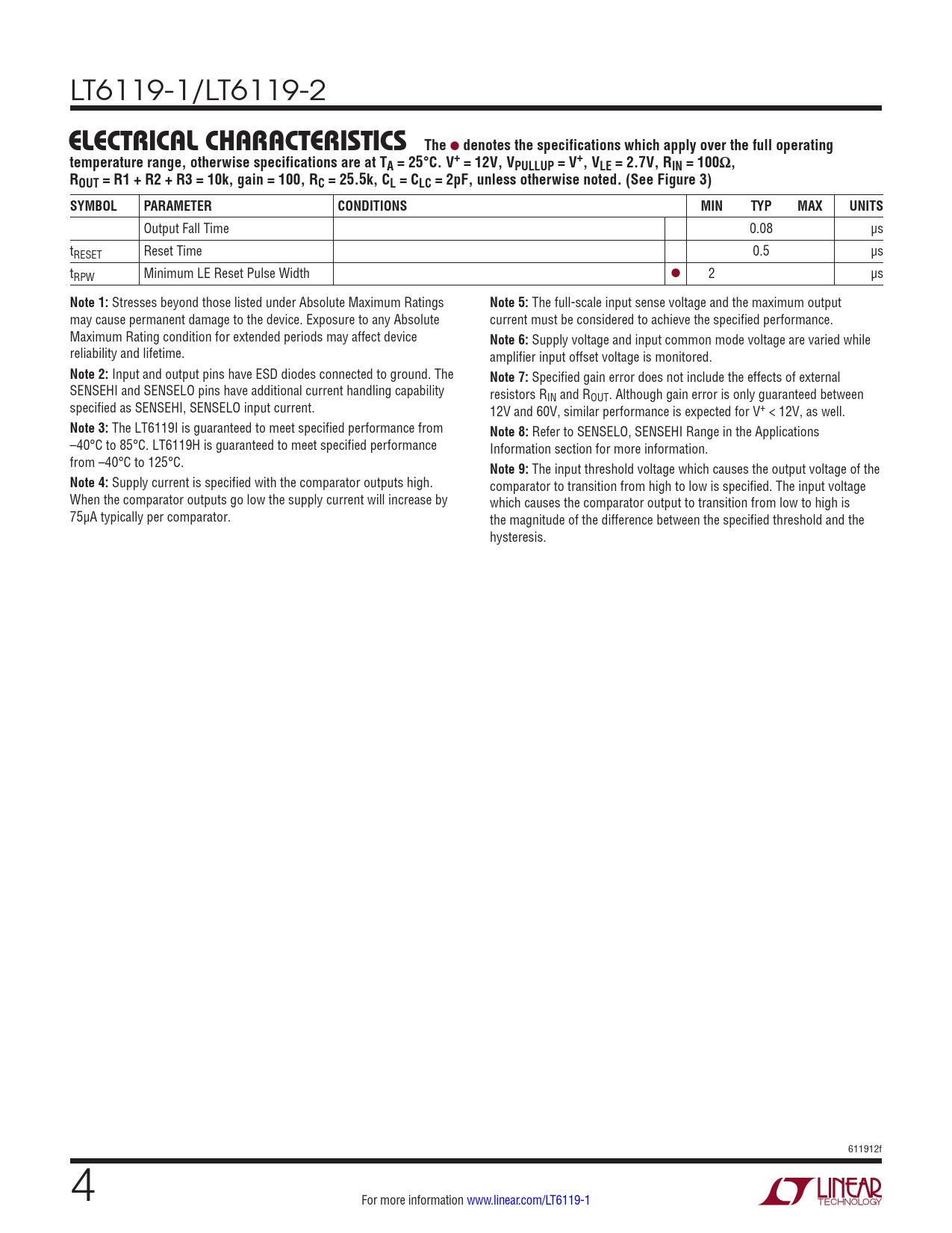 LT6119-1/LT6119-2 e lecTrical characTerisTics The l denotes the specifications which apply over the full operatingtemperature range, otherwise specifications are at TA = 25°C. V+ = 12V, VPULLUP = V+, VLE = 2.7V, RIN = 100Ω,ROUT = R1 + R2 + R3 = 10k, gain = 100, RC = 25.5k, CL = CLC = 2pF, unless otherwise noted. (See Figure 3) SYMBOLPARAMETERCONDITIONSMINTYPMAXUNITS Output Fall Time 0.08 µs tRESET Reset Time 0.5 µs tRPW Minimum LE Reset Pulse Width l 2 µs Note 1: Stresses beyond those listed under Absolute Maximum Ratings Note 5: The full-scale input sense voltage and the maximum output may cause permanent damage to the device. Exposure to any Absolute current must be considered to achieve the specified performance. Maximum Rating condition for extended periods may affect device Note 6: Supply voltage and input common mode voltage are varied while reliability and lifetime. amplifier input offset voltage is monitored. Note 2: Input and output pins have ESD diodes connected to ground. The Note 7: Specified gain error does not include the effects of external SENSEHI and SENSELO pins have additional current handling capability resistors RIN and ROUT. Although gain error is only guaranteed between specified as SENSEHI, SENSELO input current. 12V and 60V, similar performance is expected for V+ < 12V, as well. Note 3: The LT6119I is guaranteed to meet specified performance from Note 8: Refer to SENSELO, SENSEHI Range in the Applications –40°C to 85°C. LT6119H is guaranteed to meet specified performance Information section for more information. from –40°C to 125°C. Note 9: The input threshold voltage which causes the output voltage of the Note 4: Supply current is specified with the comparator outputs high. comparator to transition from high to low is specified. The input voltage When the comparator outputs go low the supply current will increase by which causes the comparator output to transition from low to high is 75µA typically per comparator. the magnitude of the difference between the specified threshold and the hysteresis. 611912f 4 For more information www.linear.com/LT6119-1 Document Outline Features Applications Description Typical Application Absolute Maximum Ratings Pin Configuration Order Information Electrical Characteristics Typical Performance Characteristics Pin Functions Block Diagrams Applications Information Typical Applications Package Description Typical Application Related Parts