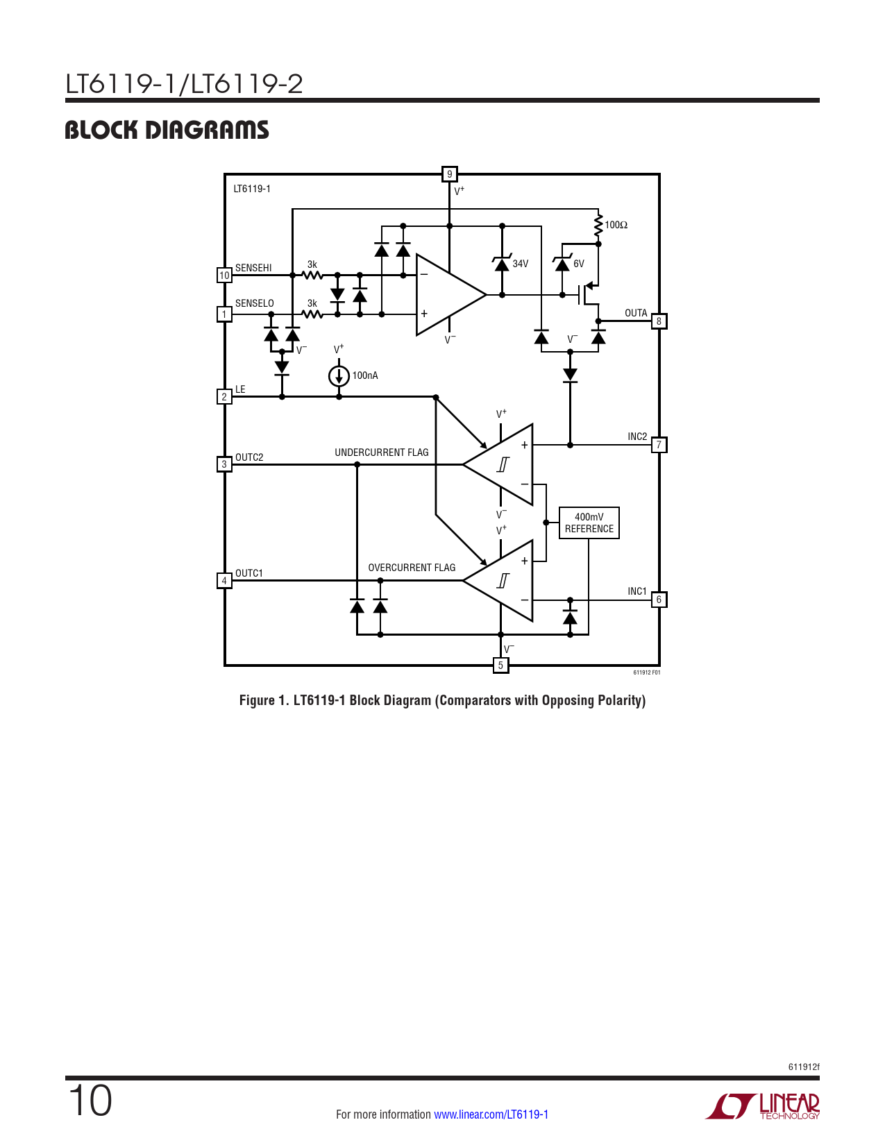 9 LT6119-1 V+ 100Ω 3k SENSEHI 34V 6V 10 – SENSELO 3k 1 + OUTA 8 V– V– V– V+ 100nA LE 2 V+ + INC2 7 UNDERCURRENT FLAG OUTC2 3 – V– 400mV V+ REFERENCE + OVERCURRENT FLAG OUTC1 4 – INC1 6 V– 5 611912 F01
