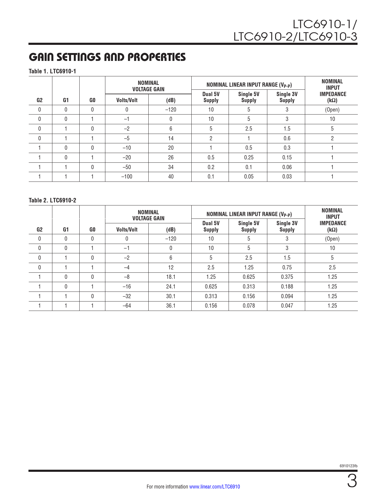 gain seTTings anD properTies Table 1. LTC6910-1. NOMINAL. NOMINAL LINEAR INPUT RANGE (V. VOLTAGE GAIN. P-P). INPUT. Dual 5V